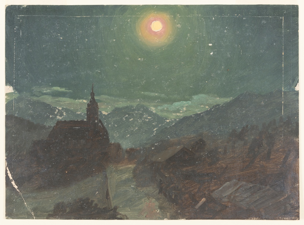 Drawing, Moonlight over an Alpine Village; Frederic Edwin Church (American, 1826–1900); USA; oil and graphite on paperboard; 24 × 32.7 cm (9 7/16 × 12 7/8 in.); Gift of Louis P. Church; 1917-4-1369