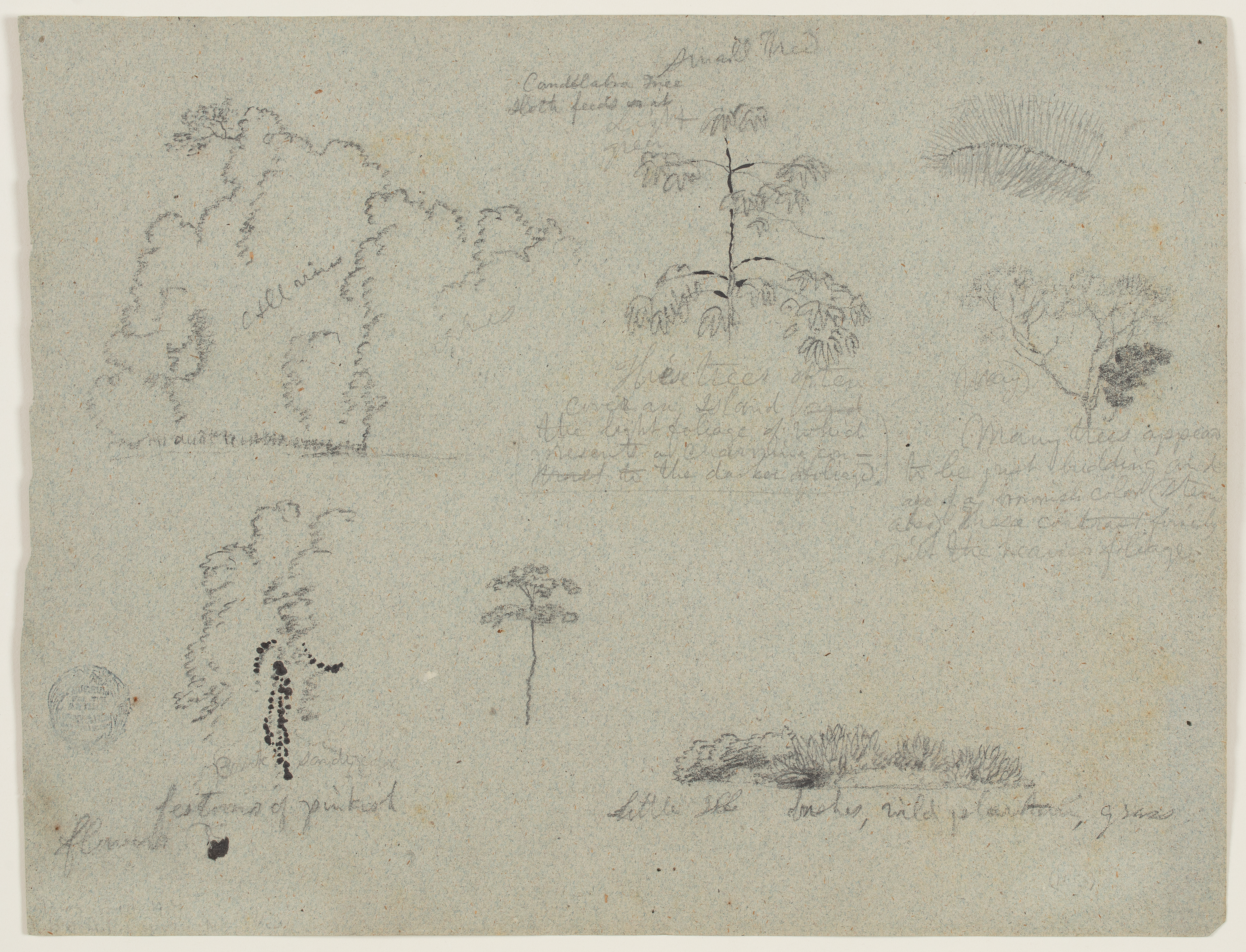 Inscribed in graphite, upper center: Small Tree / Candelabra tree / sloth feeds on it. / Light / green; center left: All vines / vines; center: These trees often / cover an Island and / the light foliage of which / presents a charming con- / trast to the darker foliage; center right: May / Many trees appear / to be just budding and / are of a brownish color (stems / also) These contrast finely / with the heavier foliage; lower left: Bank sandy / festoons of pinkish / flowers; lower right: little Isle bushes, wild plantain, grass