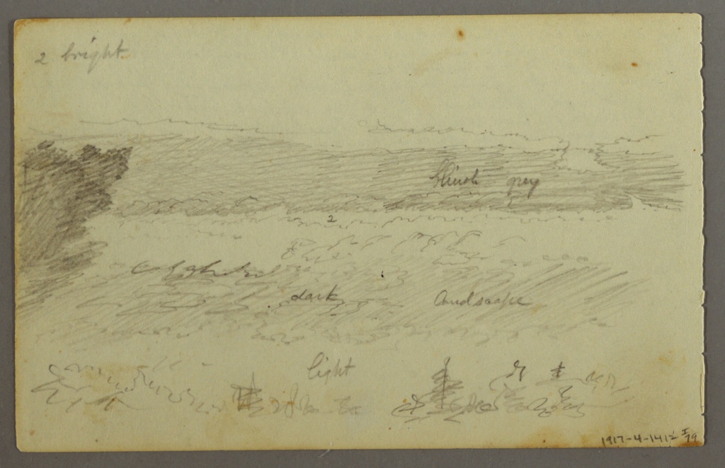 Inscribed: in graphite, upper margin: 1 The upper edge of this cloud is quite brilliantly tipped with yellow / 2 A fuzzy appearance yellow and orange at the lower parts of the (fuzziness) / 3 Stylish purple - 4, yellowish light / 5 numerous broken clouds purple (dark) with a golden edge toward the sun / 6 greenish gold blending into - 6 - an exquisite light blue / 7 the most brilliant clouds of all dazzlingly yellow on the outer edge / 8 The mountains are etherial [sic] beautiful dark purple. / 9 This cloud is of a darkish idescribable [sic] color of grey at the edges lower / part yellowish bright; in graphite, center: 6 6 / 1 / 2 7 7 7 7 9 9 / 2 2 2 / 8 6 / 5 5 5 / 4 3 3; in graphite, verso upper left: 2 bright; in graphite, verso center: bluish grey / 2 / dark landscape; in graphite, verso lower center: light