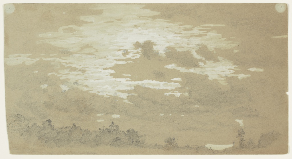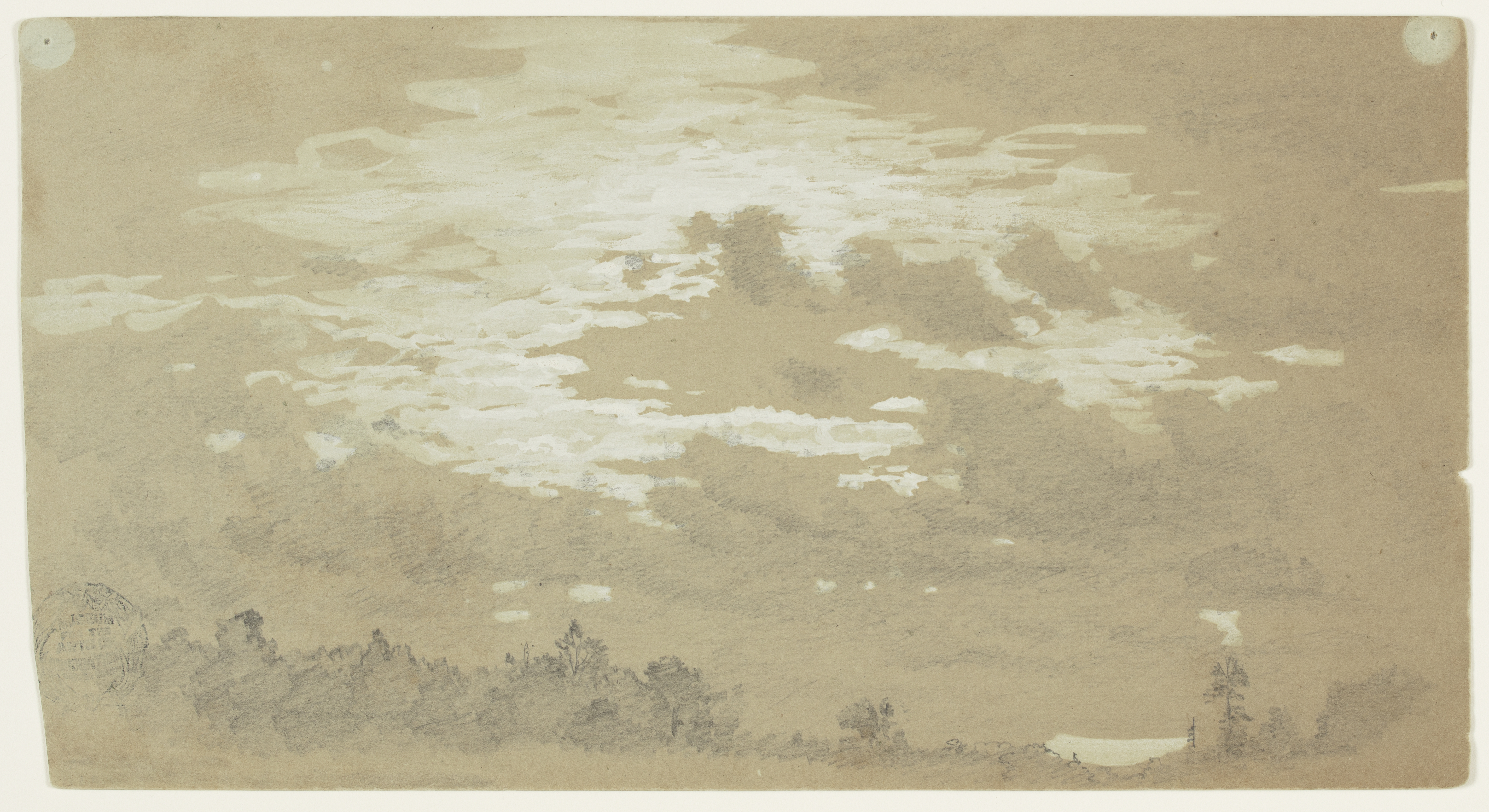 Drawing, Cloudy Sky over a Wooded Ridge, Niagara Falls; Frederic Edwin Church (American, 1826–1900); USA; graphite and white gouache on grey-green laid paper; verso: graphite and white gouache; 12.3 × 23 cm (4 13/16 × 9 1/16 in.); Gift of Louis P. Church; 1917-4-143-a