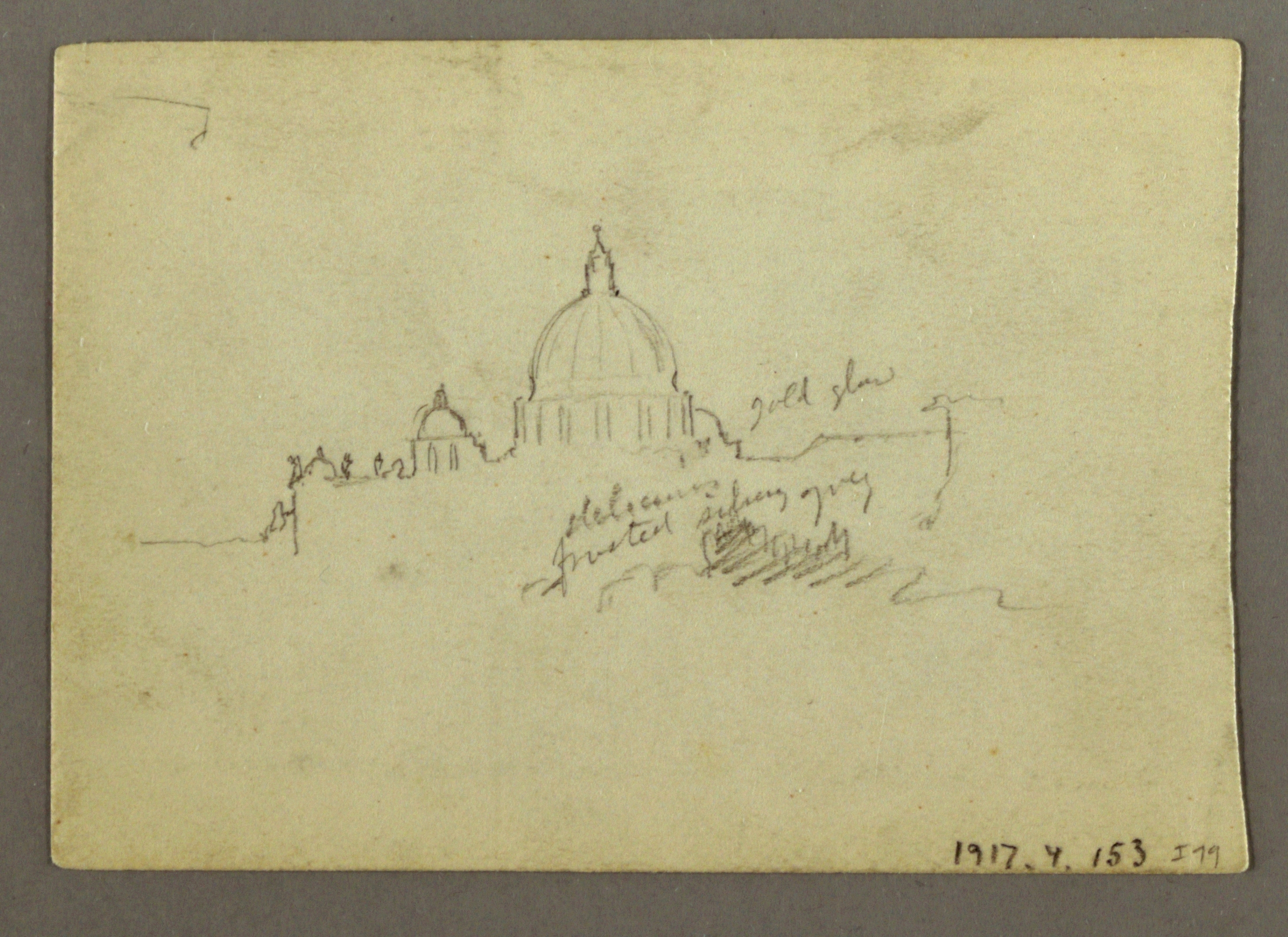 Drawing, Distant View of St. Peter's Basilica, Rome, Italy; Frederic Edwin Church (American, 1826–1900); Italy; graphite on tan wove paper; verso: graphite; 8.6 × 12.4 cm (3 3/8 × 4 7/8 in.); Gift of Louis P. Church; 1917-4-153