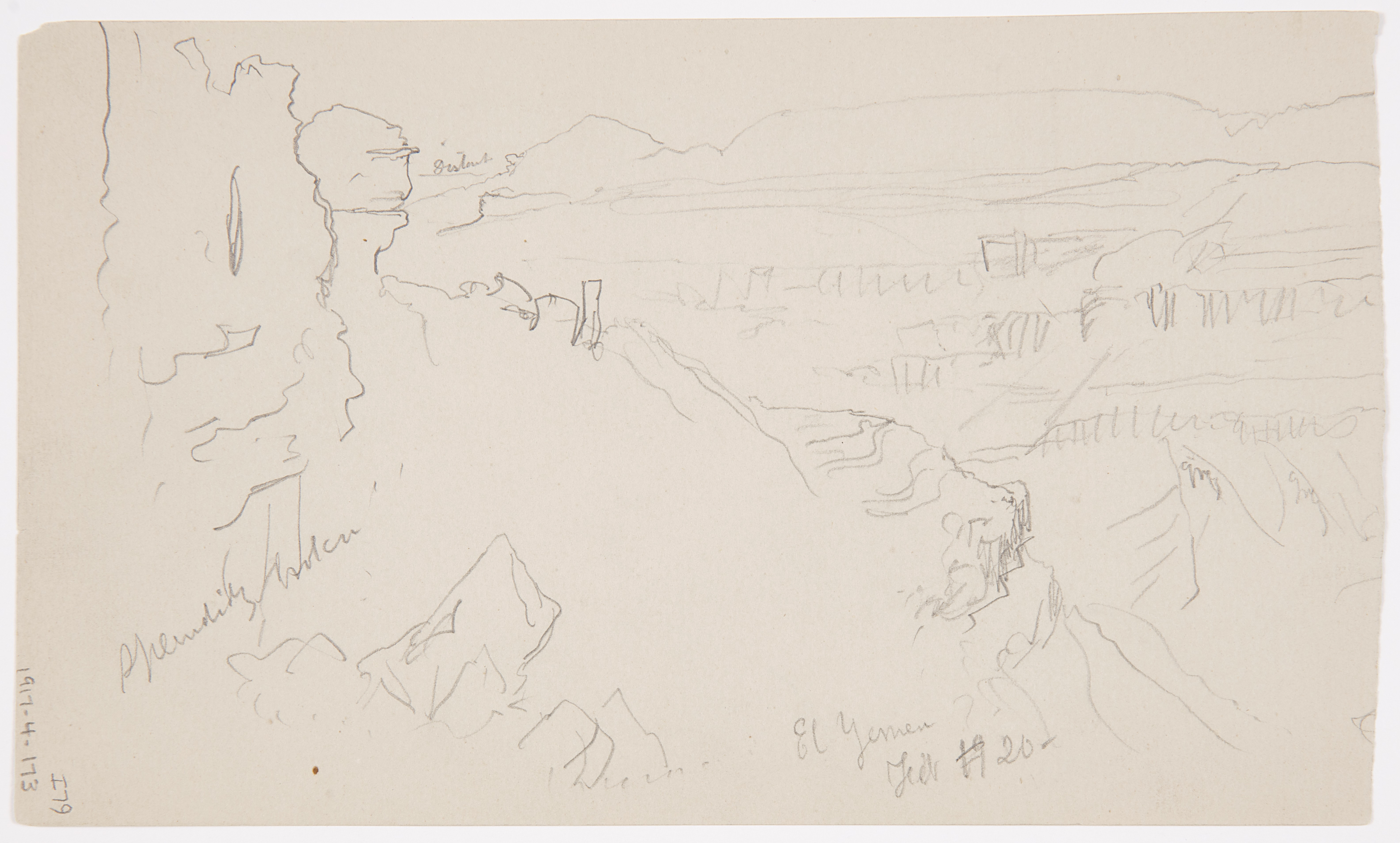 Inscribed in graphite, upper center: soft greenish sky mountains blue & gold grey- / snow; center: stony; lower center: Plain streaked with reddish-brown green / in wadys rich green / streaked with shadows-; lower right: 3; verso upper left: Distant; lower left: splendidly broken; lower right: El Yemen / Feb [struck out: 19] 20-