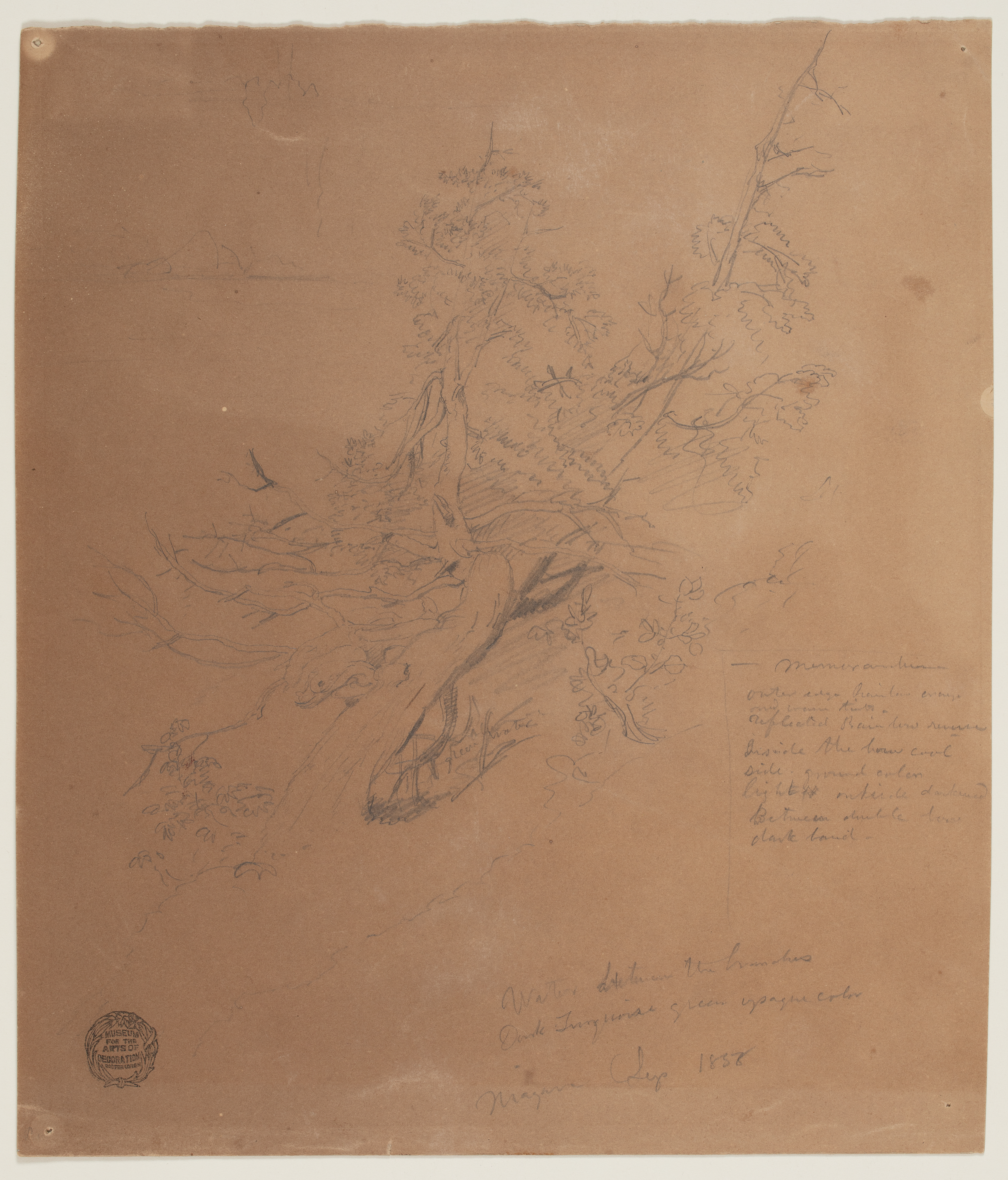 Drawing, Rugged Tree, Niagara Falls; Frederic Edwin Church (American, 1826–1900); Canada; graphite on light brown wove paper; 29.8 × 25.4 cm (11 3/4 × 10 in.); Gift of Louis P. Church; 1917-4-181