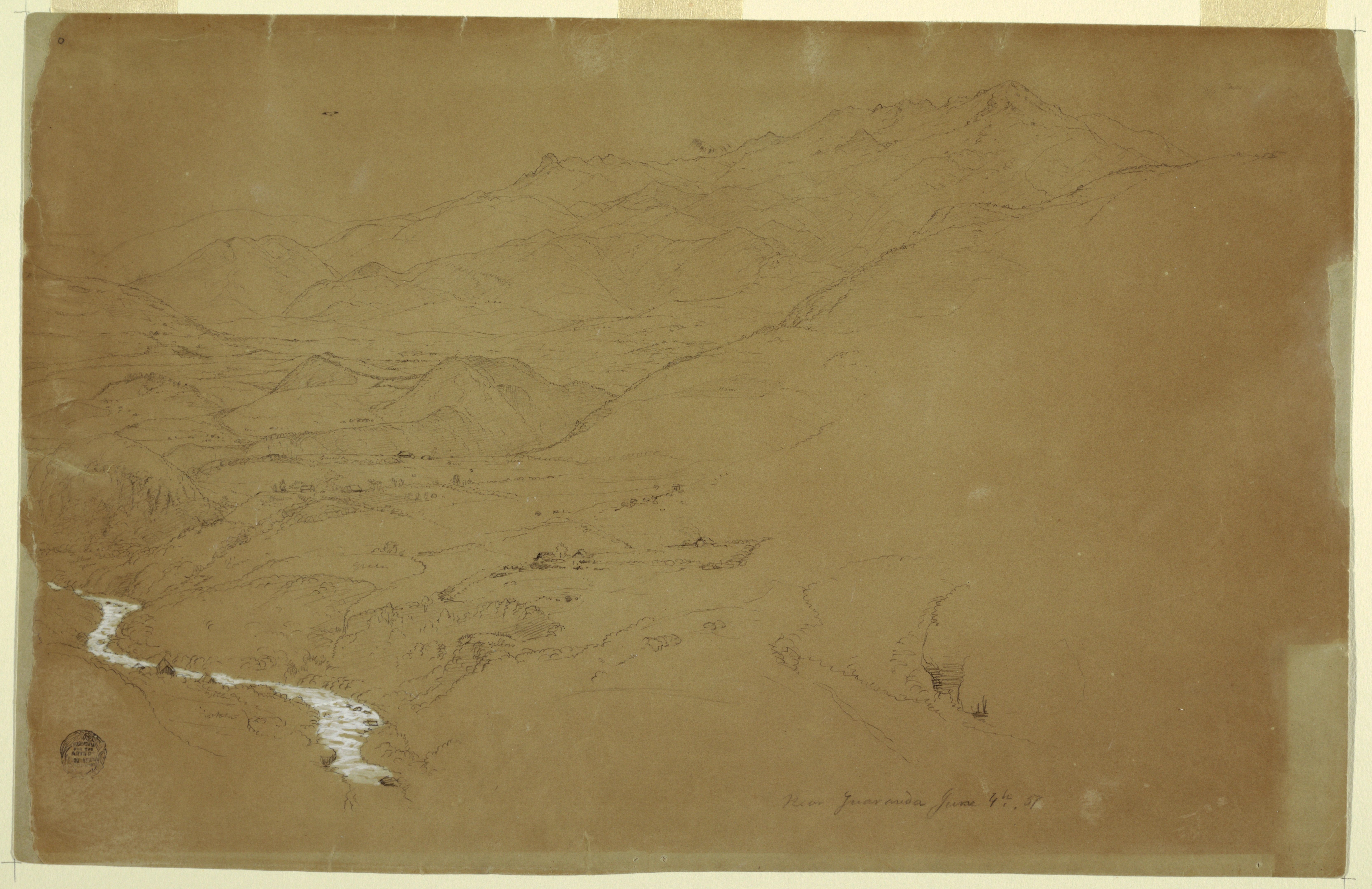 Drawing, Valley and Mountains near Guaranda, Ecuador; Frederic Edwin Church (American, 1826–1900); Ecuador; graphite, brush and white gouache on light brown wove paper; 34.8 × 54.6 cm (13 11/16 × 21 1/2 in.); Gift of Louis P. Church; 1917-4-204