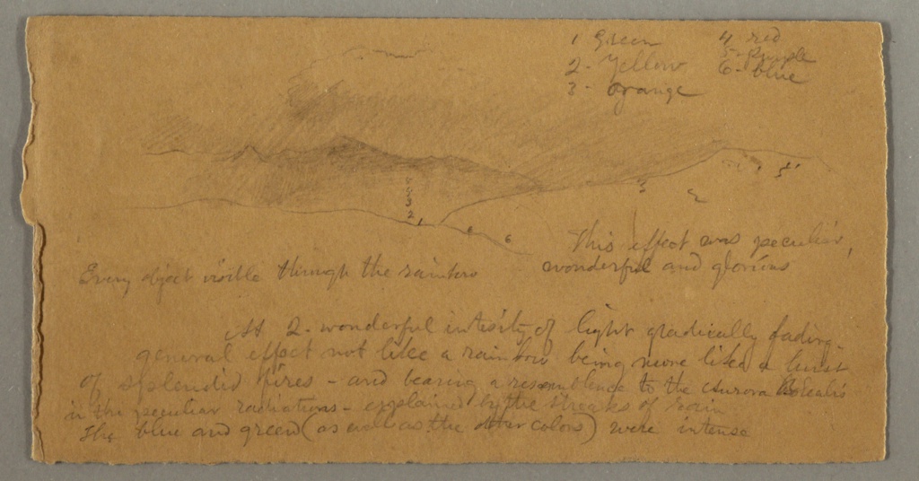 Inscribed in graphite, upper right: 1 Green / 2 - Yellow / 3 - Orange / 4 Red / 5 - Purple / 6 - blue; center left: Every object visible through the rainbow; center: 5 / 4 / 3 / 2 / 1 / 6 / 6; center right: 3 2 5 / This effect was peculiar, / wonderful and glorious; lower center: At 2 - wonderful intensity of light gradually fading - / general effect not like a rainbow being more like a burst / of splendid fires - and bearing a resemblance to the Aurora Borealis / in the peculiar radiations - explained by the steaks of rain / The blue and green (as well as the other colors) were intense