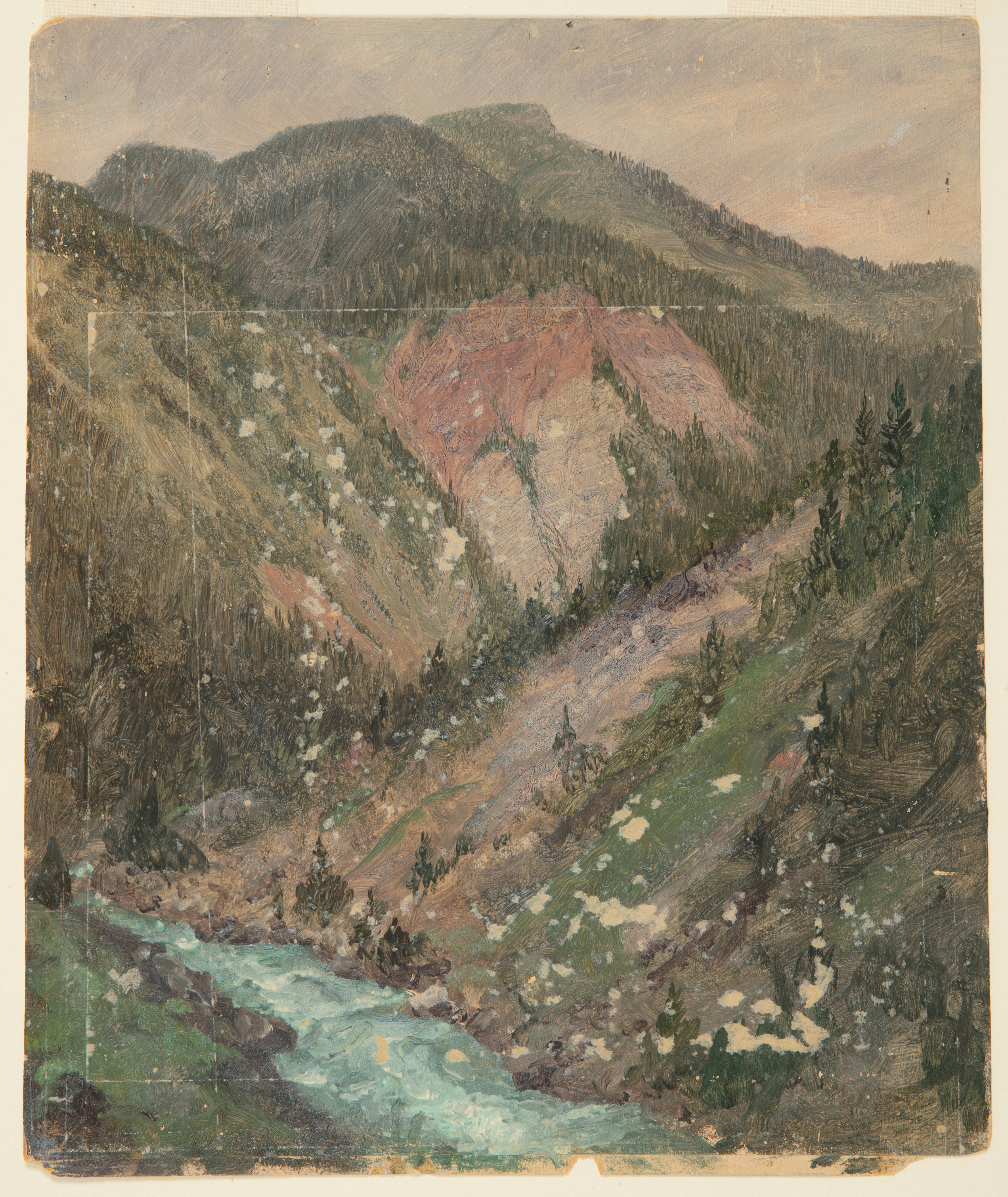 Drawing, Alpine Landscape (Bavaria, Switzerland, or Italy); Frederic Edwin Church (American, 1826–1900); USA; brush and oil, graphite on tan paperboard; 30.2 × 25.1 cm (11 7/8 × 9 7/8 in.); Gift of Louis P. Church; 1917-4-287-b