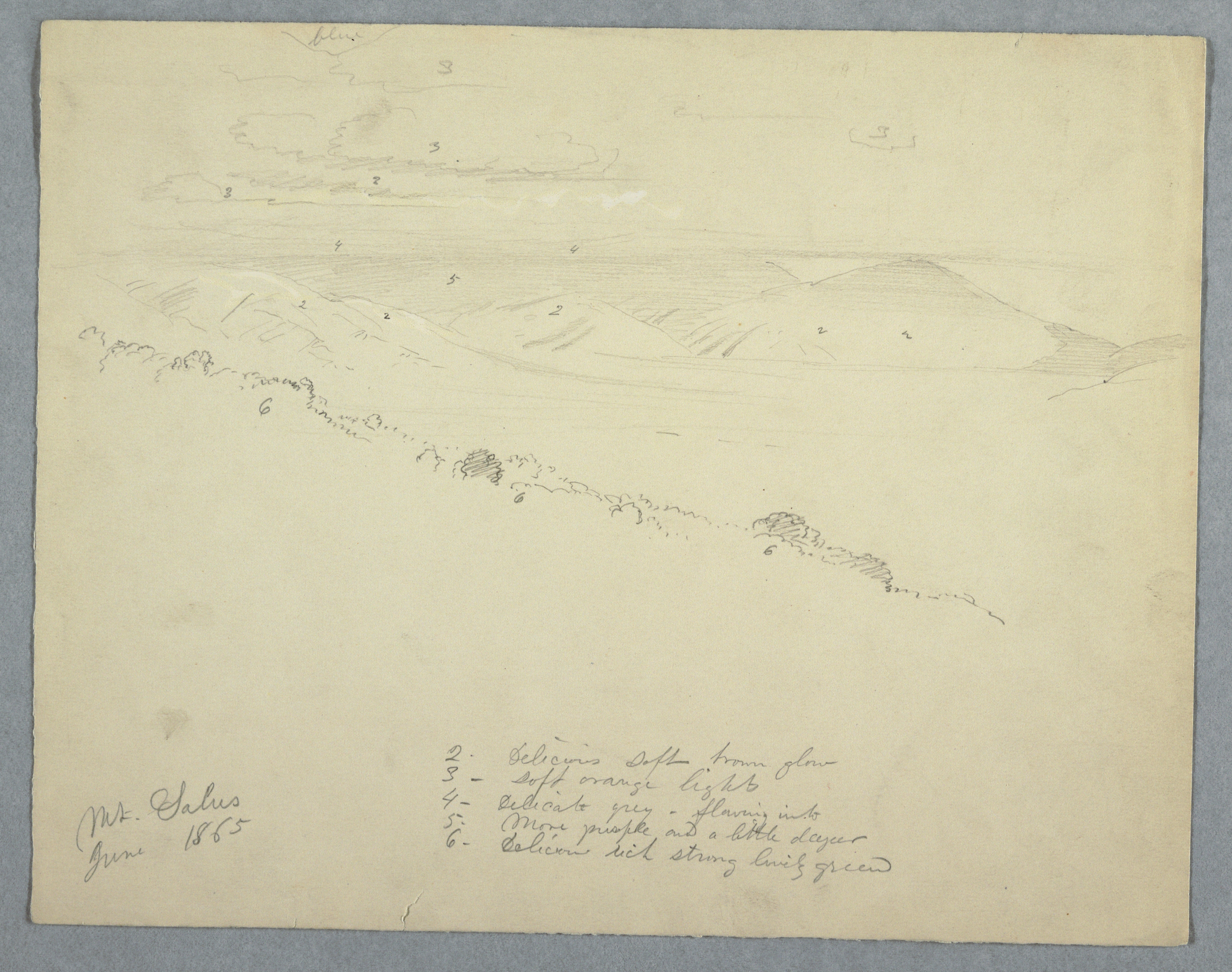 Inscribed in graphite, upper left: blue / 3 / 3 / 3 3; upper right: 3; center: 4 4 / 5 / 2 2 2 2 2 / 6 / 6 / 6; lower left: Mt. Salus / June 1865; lower center: 2 - Delicious soft brown glow / 3 - soft orange light / 4 - Delicate grey, flowing into / 5 - More purple and a little deeper / 6 - Delicious rich strong lively green