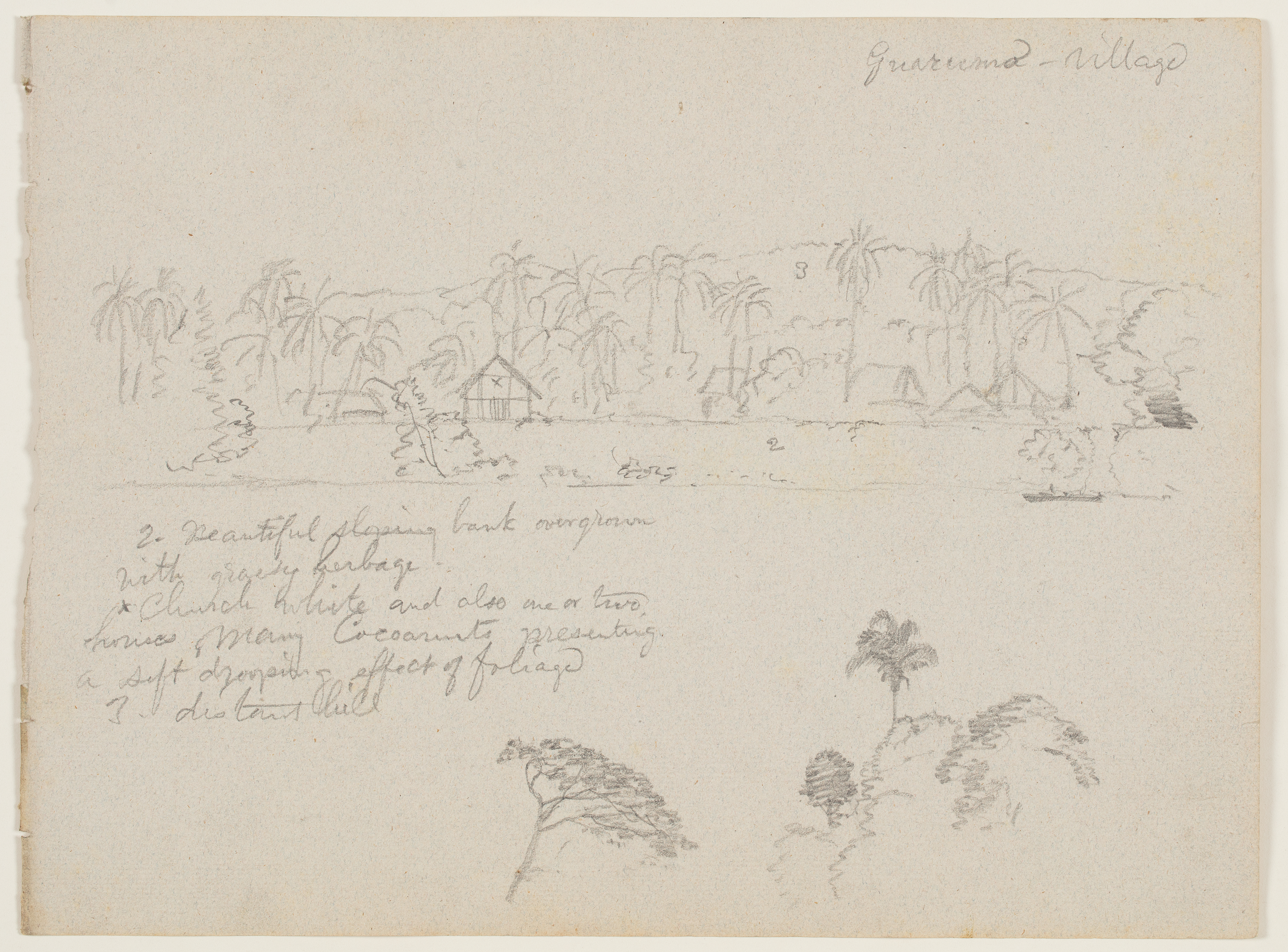 Inscribed in graphite, upper right: Guaruma - Village; center: 3 / X / 2; lower left: 2 - Beautiful sloping band overgrown / with grassy herbage / X Church white and also one or two / houses. Many Cocoanuts presenting / a soft drooping effect of foliage / 3 - distant hill