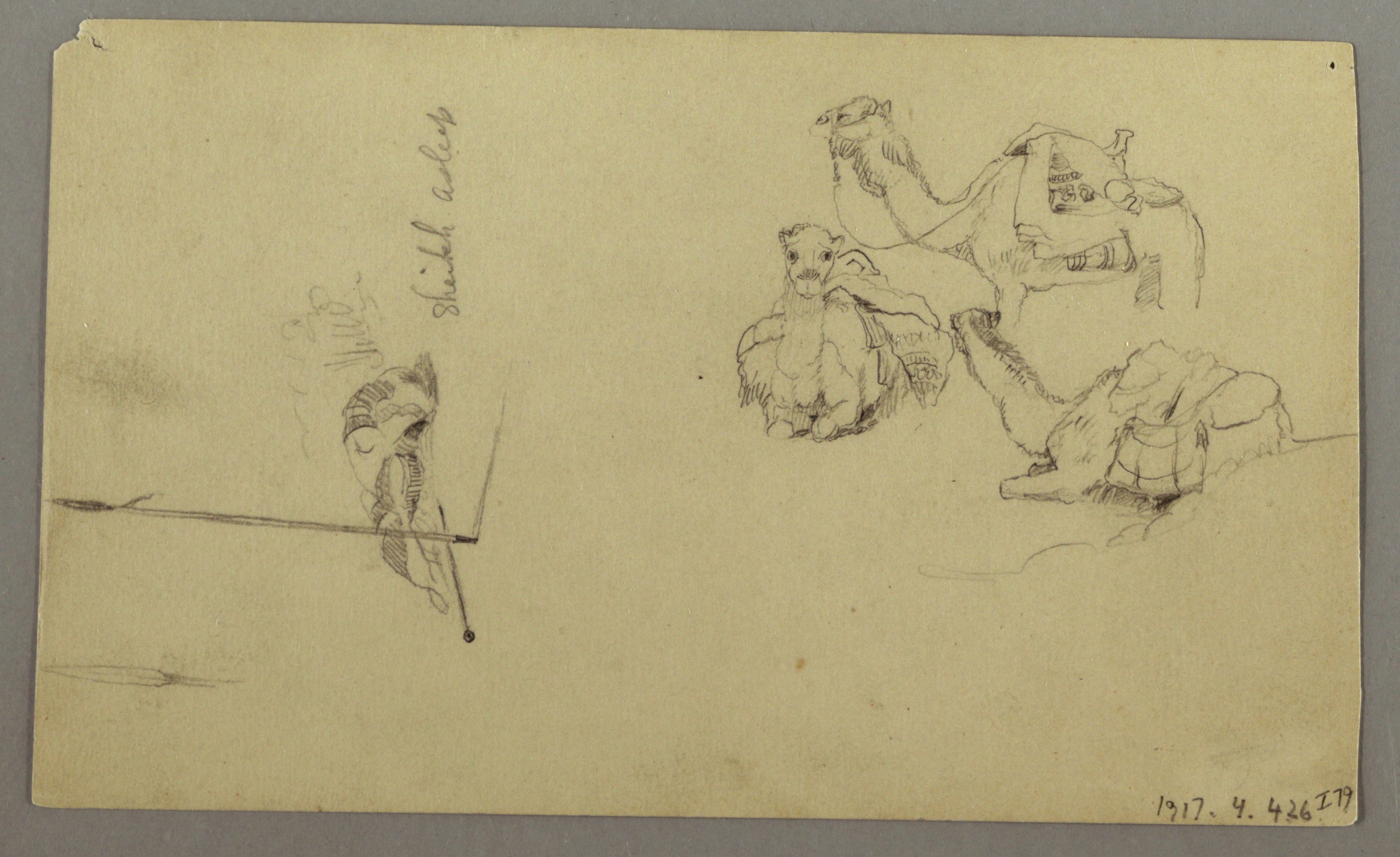 Inscribed: in graphite, upper right: 22 - Feb / Oasis at / Kadesh Barnea; in graphite, center: 4 / 2 / 2 / 4 / Water; in graphite, center right: yel grey / 3; in graphite, lower left: Whitish / whitish; in graphite, lower center: Brownish; in graphite, lower right: 2 - Seeded grass / 3 - Rich dark palm / 4 - Yellow grass; in graphite, verso upper left: Sheikh asleep