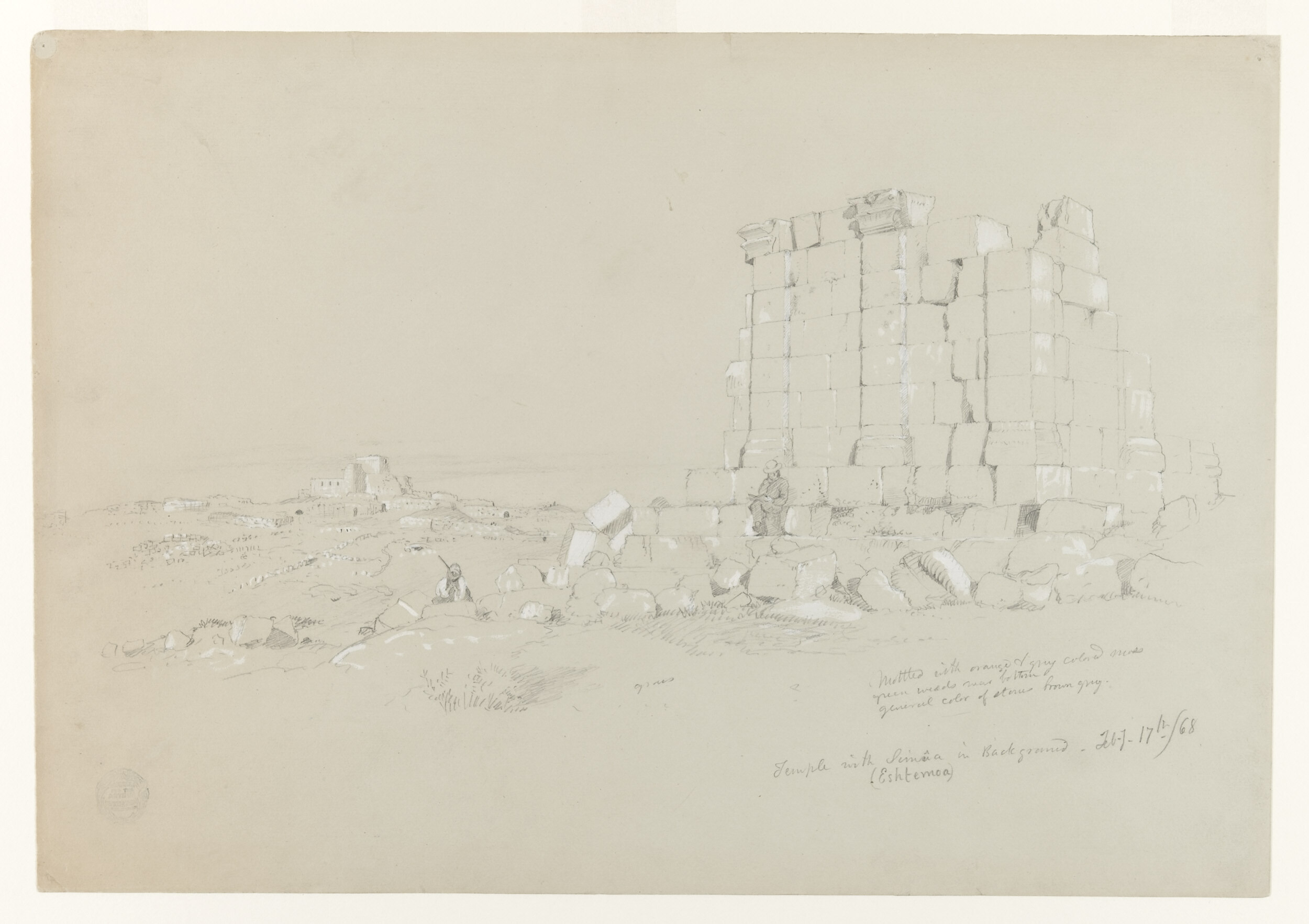 Inscribed in graphite, lower center: grass; lower right: Mottled with orange & grey colored moss / green weeds near bottom / general color of stones brown grey- / Temple with Simûa in Background - Feby - Feby 17th /68 / (Eshtemoa)