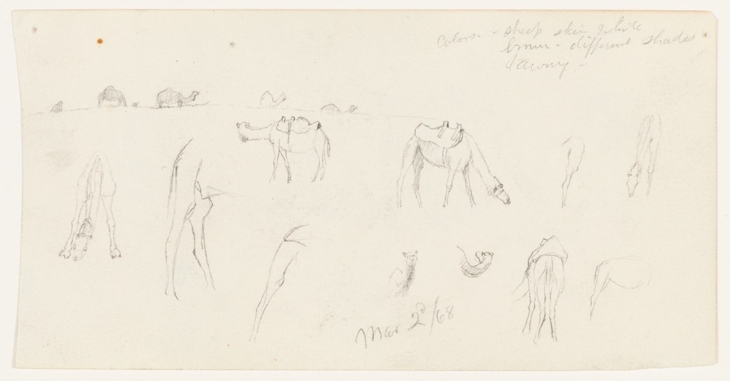 Inscribed: in graphite, upper right: Colors - sheep skin white / brown - different shades / tawny -; in graphite, lower center: Mar 2d /68; in graphite, verso upper margin: Camels head - 3 times length of this leaf; in graphite, verso center: 2 / 1 3/5 / 2 1/4 / 1 1/8 length / 3