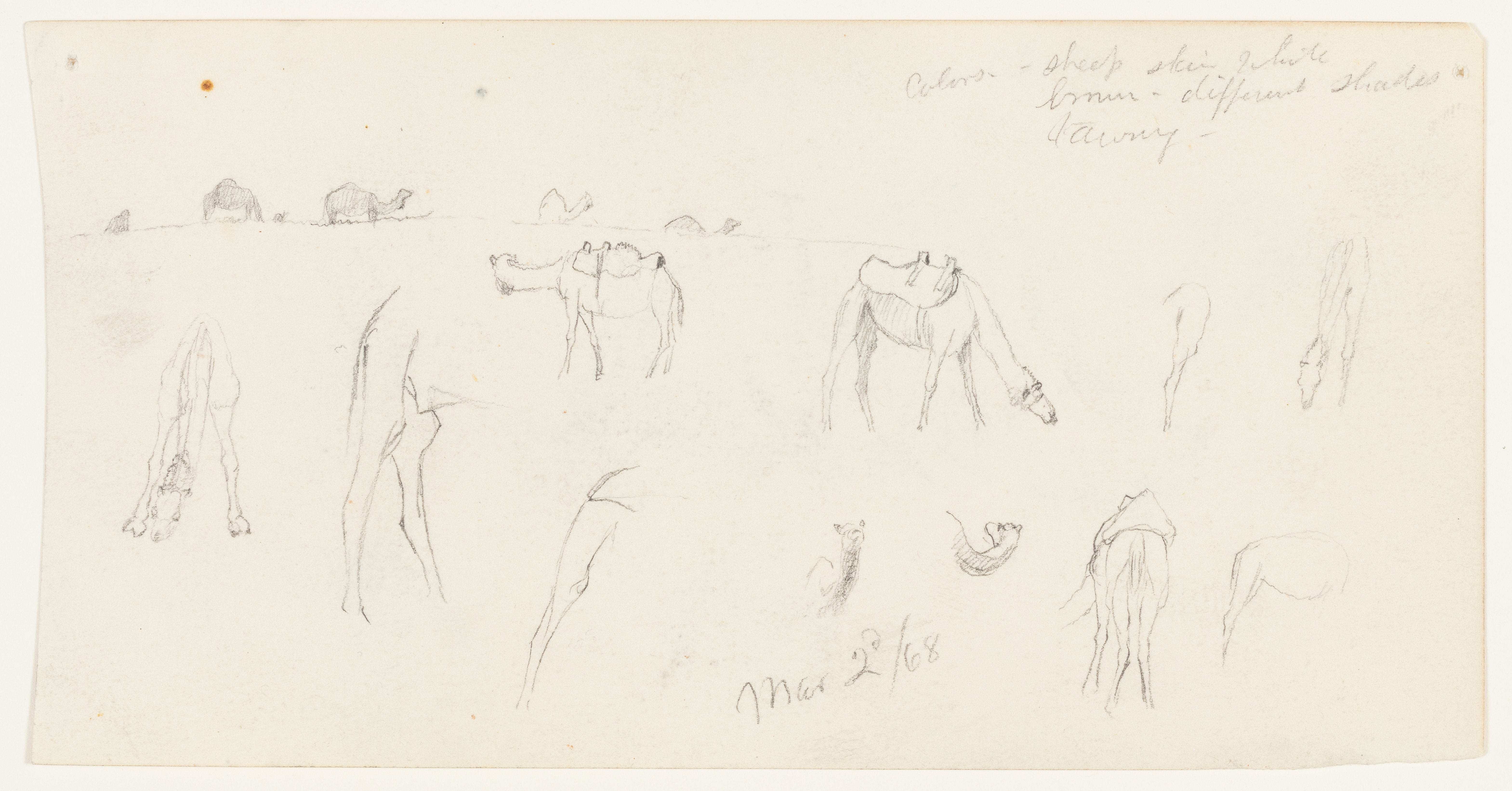 Drawing, Camel Studies, Palestine; Frederic Edwin Church (American, 1826–1900); USA; graphite on white wove paper; verso: graphite; 8.6 × 16.8 cm (3 3/8 × 6 5/8 in.); Gift of Louis P. Church; 1917-4-471