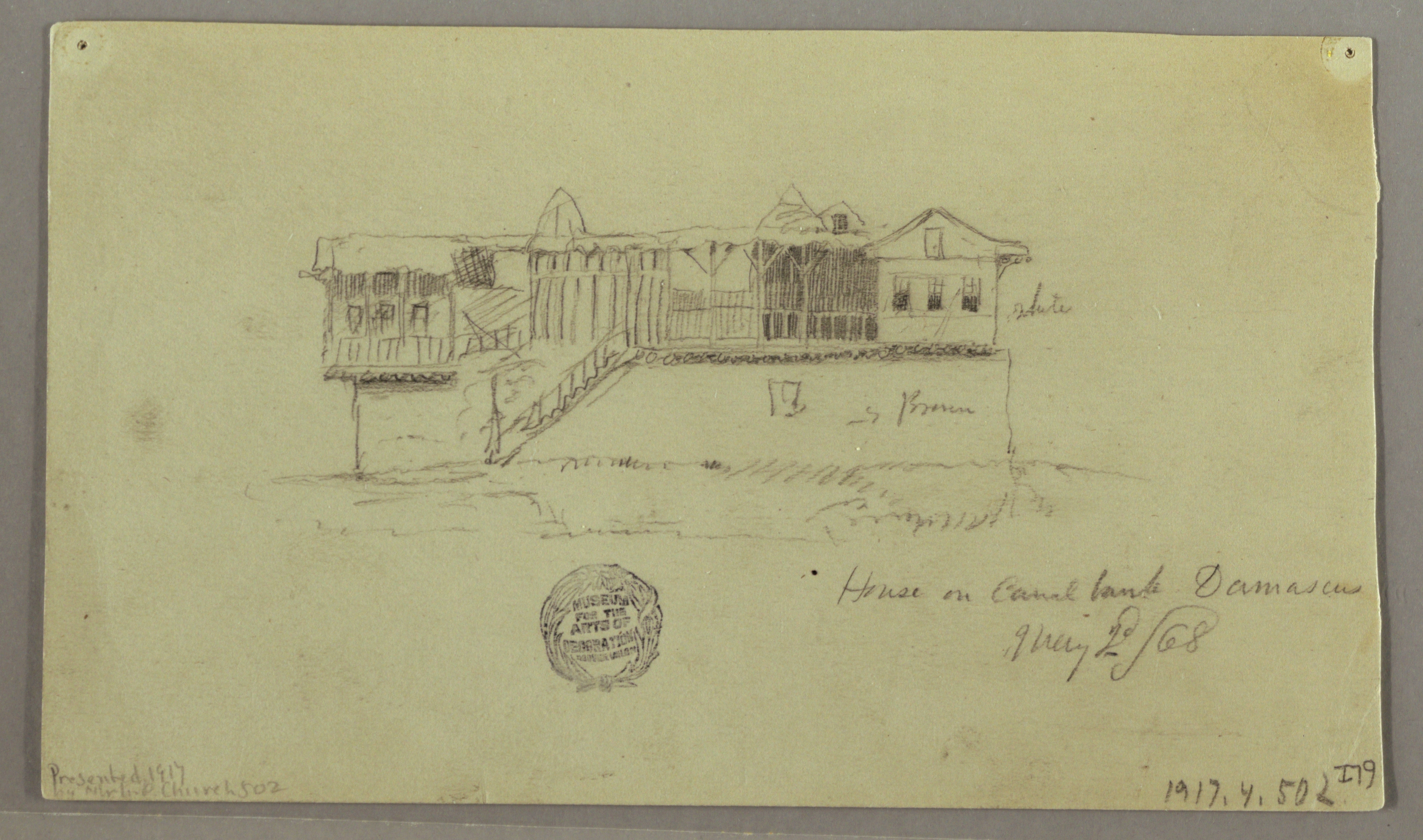 Inscribed: in graphite, center: warm / olive green / & yellow very light especially near trees; in graphite, center left: Bt. sienna / Streaks / rich green / olive - brown / green; in graphite, center right: green / stony / warm grey / stony; in graphite, lower center: road whitish cobble stones; in graphite, lower right: (on next leaf) / Damascus / Apl. 29th /68; in graphite, verso center: white / Brown; in graphite, verso lower right: House on Canal Bank Damascus / May 2d /68