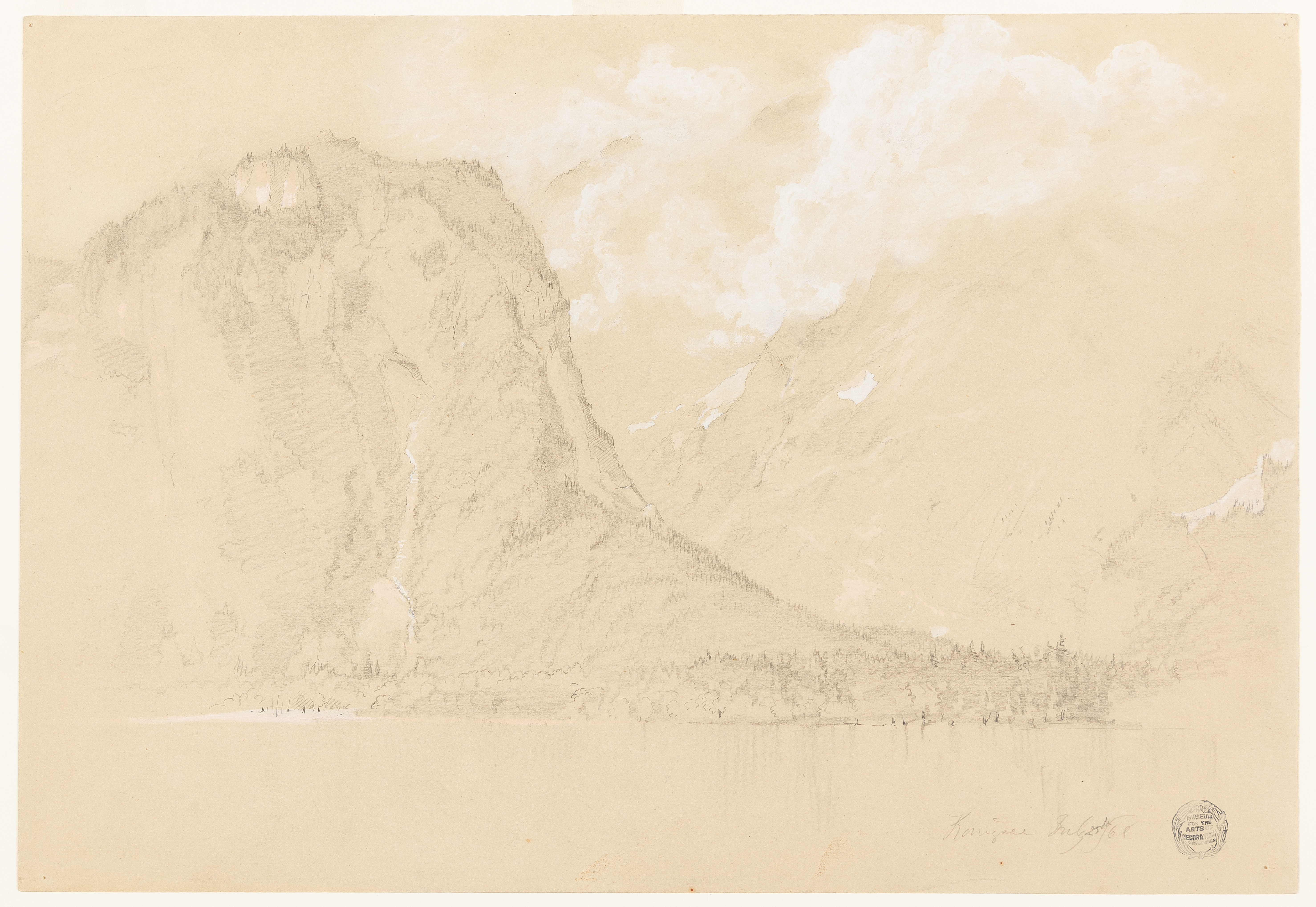 Drawing, Burgstallstein and Schrainbach Waterfall on the Königssee, Bavaria (Germany); Frederic Edwin Church (American, 1826–1900); USA; graphite and white gouache on tan laid paper; 30.2 × 43.9 cm (11 7/8 × 17 5/16 in.); Gift of Louis P. Church; 1917-4-563-c