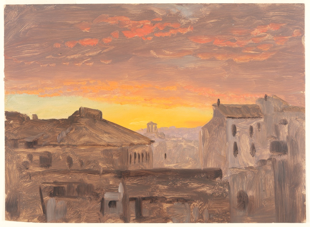 Drawing, Rooftops at Sunset, Rome; Frederic Edwin Church (American, 1826–1900); Italy; brush and oil, graphite on paperboard; 28.2 × 38.6 cm (11 1/8 × 15 3/16 in.); Gift of Louis P. Church; 1917-4-611-c