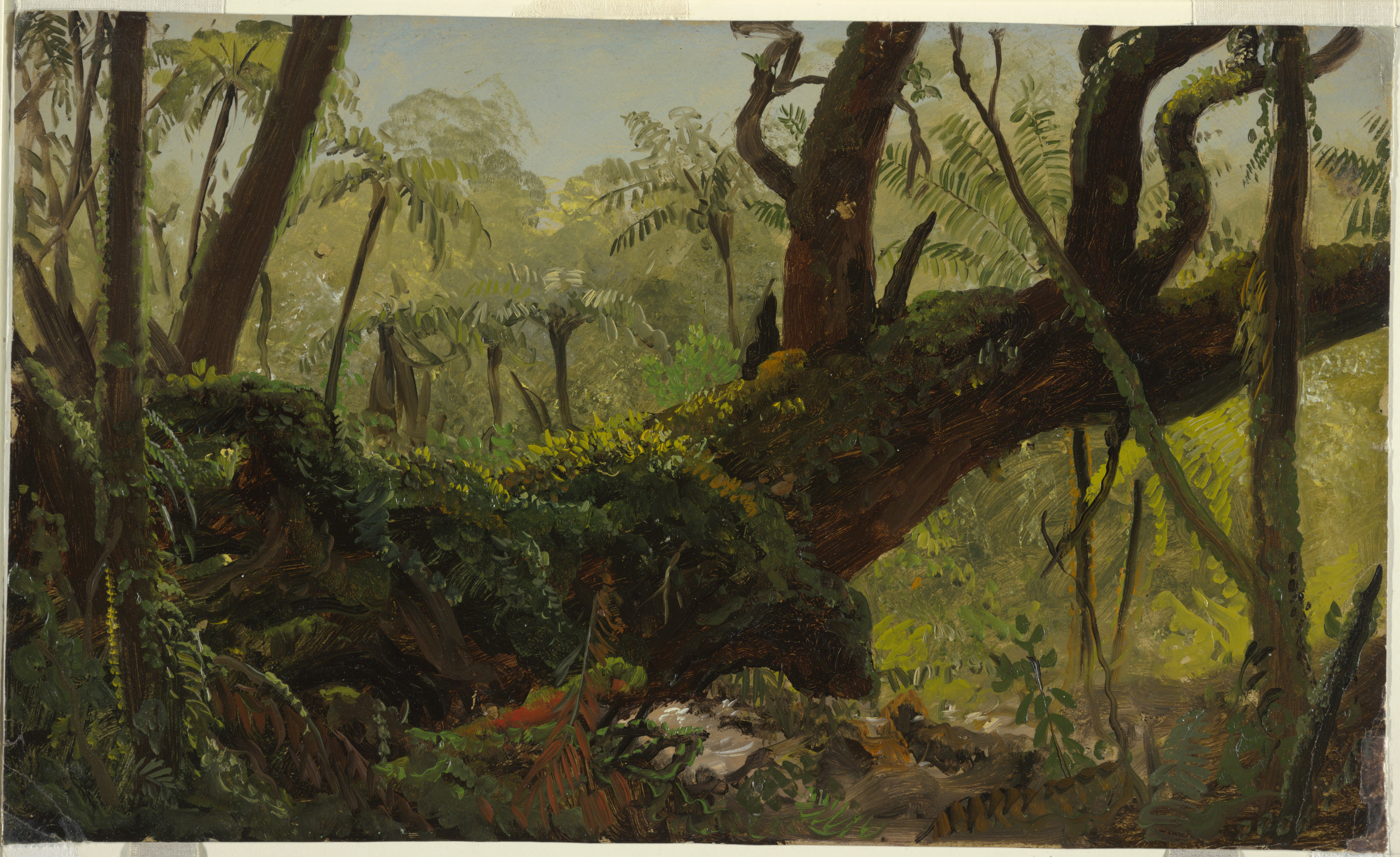 Drawing, Rainforest, Jamaica; Frederic Edwin Church (American, 1826–1900); Jamaica; oil and graphite on paperboard; 30.5 × 51 cm (12 in. × 20 1/16 in.); Gift of Louis P. Church; 1917-4-678-b