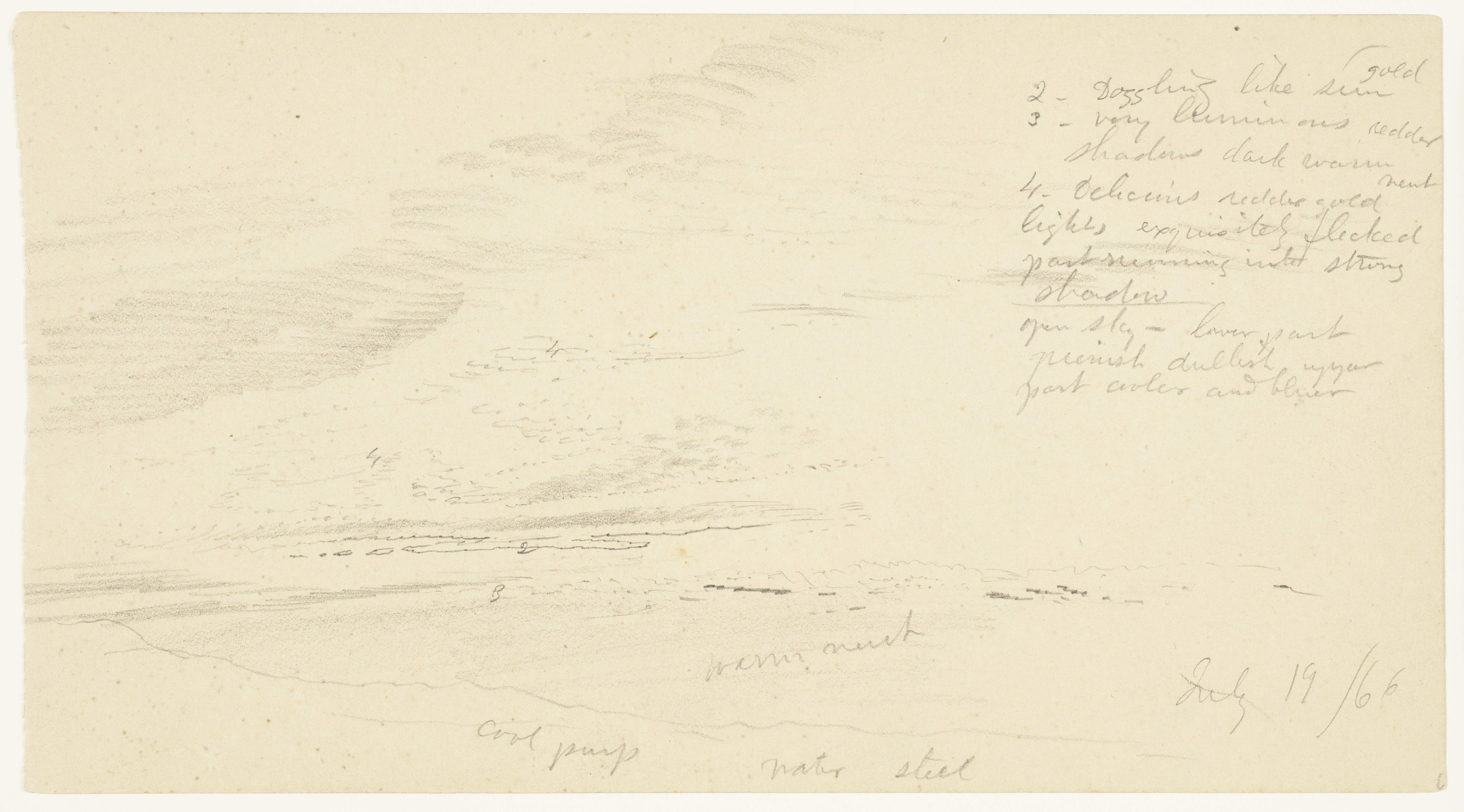 Inscribed: in graphite, upper right: 2 - Dazzling like sun / gold / 3 - very luminous redder / shadows dark warm neut / 4 - Delicious redder gold / lights exquisitely flecked / park running into strong / shadow / open sky - lower part / greenish dullish upper / part cooler and bluer; in graphite, center left: 4 / 2 / 3; in graphite, lower center: warm neut / cool purp / water steel; in graphite, lower right: July 19 /66; in graphite, verso upper center: yel / red; in graphite, center: 5 / 3 2 / 4 / 4; in graphite, lower left: July 19 /66; in graphite, lower right: 2 yellowish Daylight / 3 warmer / 4 smoky neut / 5 cool steel blue