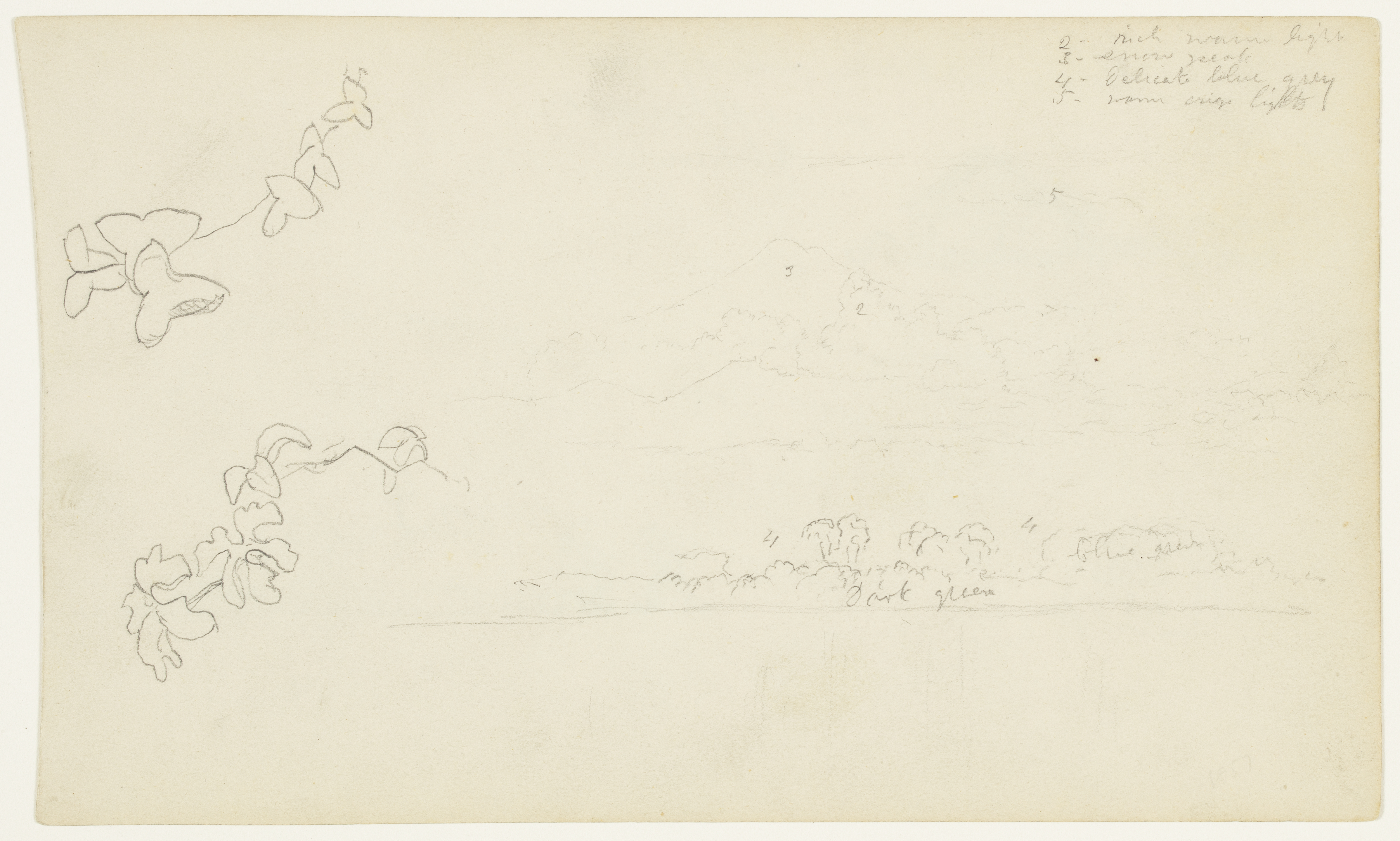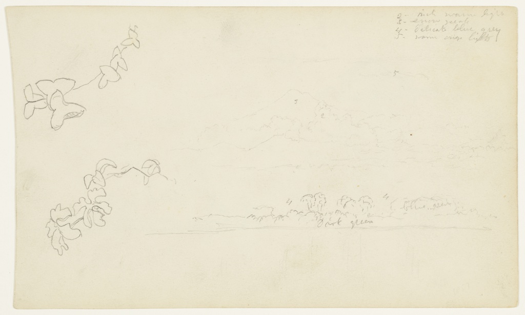 Inscribed in graphite, upper right: 2 - rich warm light / 3 - snow peak / 4 - Delicate blue grey / 5 - warm crisp lights / 5; center: 5 / 2; lower center: 4 / Dark green; lower right: 4 / blue green; verso upper left: House and floating garden of flowers / on a raft moored / to shore; verso lower right: May 57