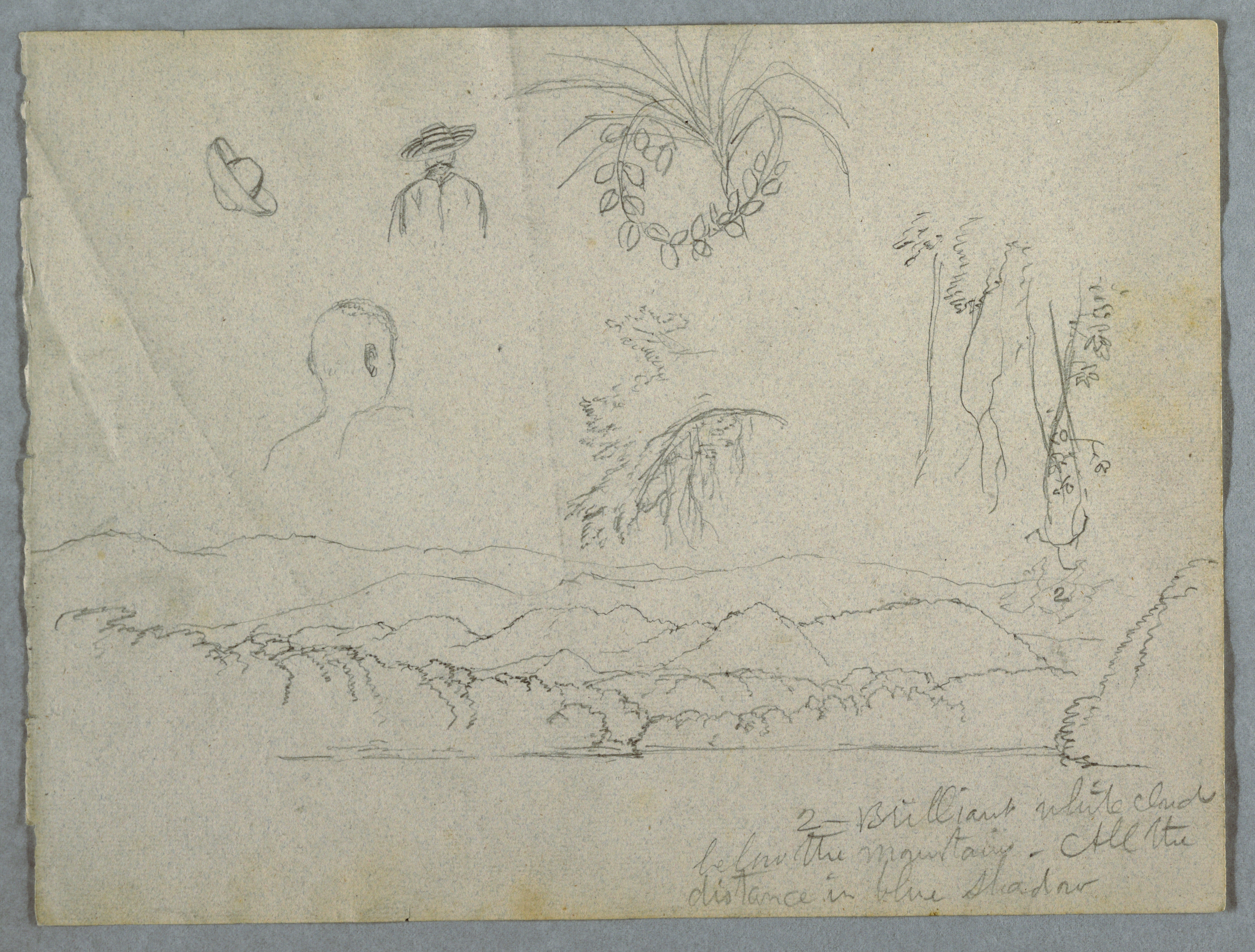 Drawing, River Bank with Mountains and Clouds, Three Plants, and Men with Hats, Colombia; Frederic Edwin Church (American, 1826–1900); graphite on gray laid paper; 21.5 × 28.6 cm (8 7/16 × 11 1/4 in.); Gift of Louis P. Church; 1917-4-869-b