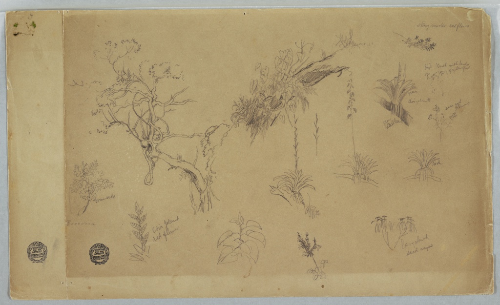 Inscribed in graphite, upper right: strong marks red flowers / High bush with branches / of yellow flowers / green / Airplants / Rose col / flowers / grey / dried leaves; lower right: large bush / seed caps; lower left: brown seeds / Bocconia / Air plant / red flower