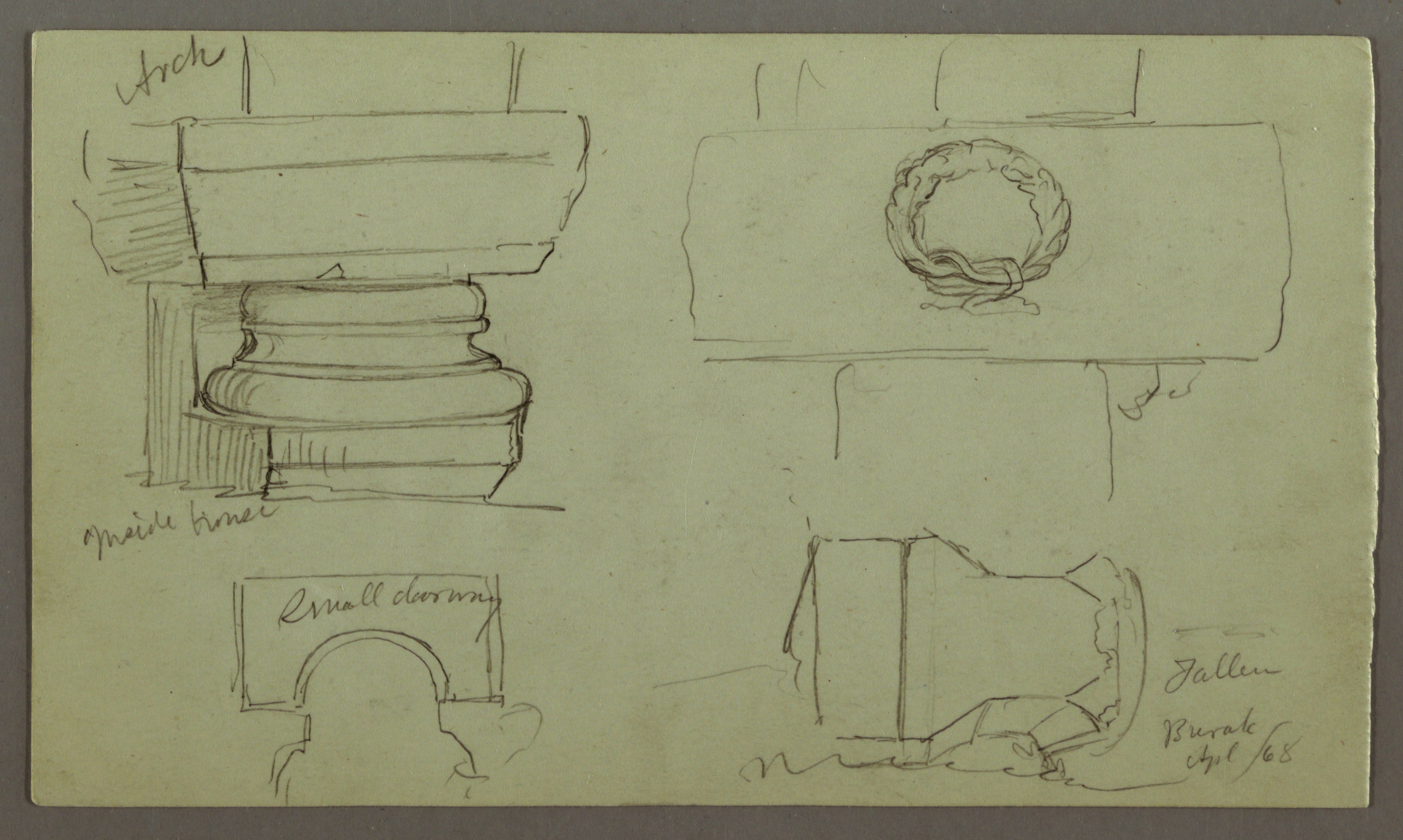 Inscribed: in graphite, upper left: Arch; in graphite, center left: Inside House; in graphite, lower left: Small doorway; in graphite, lower right: Fallen / Burak / Apl /68; in graphite, verso lower center: spout; in graphite, verso lower right: Burak Apil 27th /68