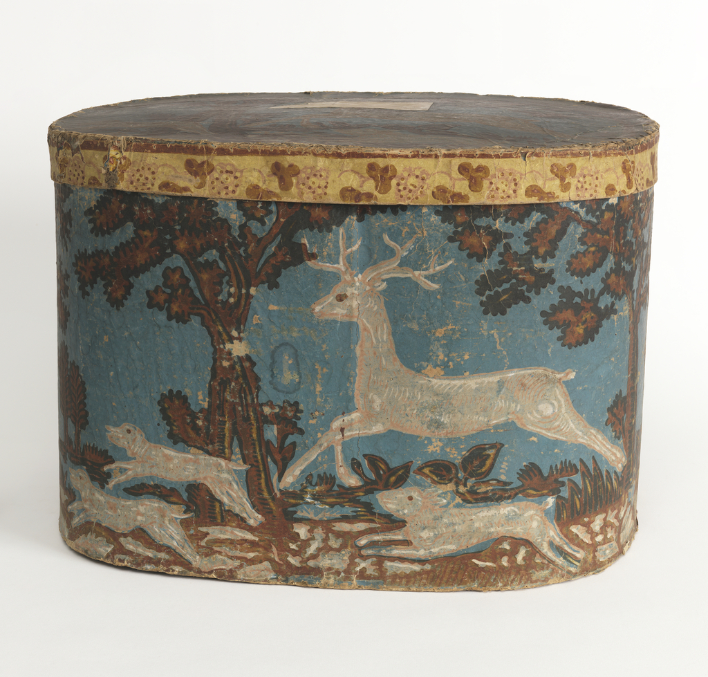 Bandbox (USA); block-printed paper, pasteboard support; 38 x 30 x 27 cm (14 15/16 x 11 13/16 x 10 5/8 in.); Gift of Eleanor and Sarah Hewitt; 1918-19-1-a,b