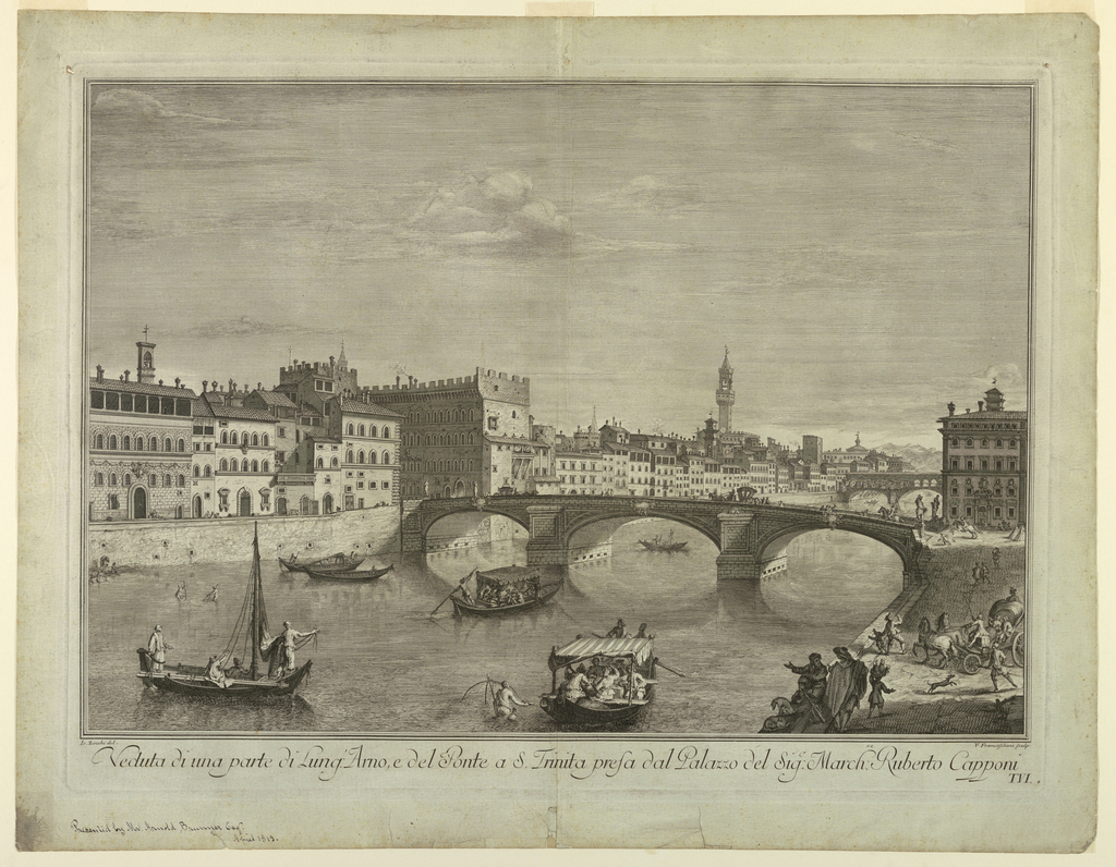 Print, View of the Lungarno and the Ponte Santa Trinita; Engraved by Francheschini; After Giuseppe Zocchi; Italy; engraving on off-white laid paper; 1919-30-5