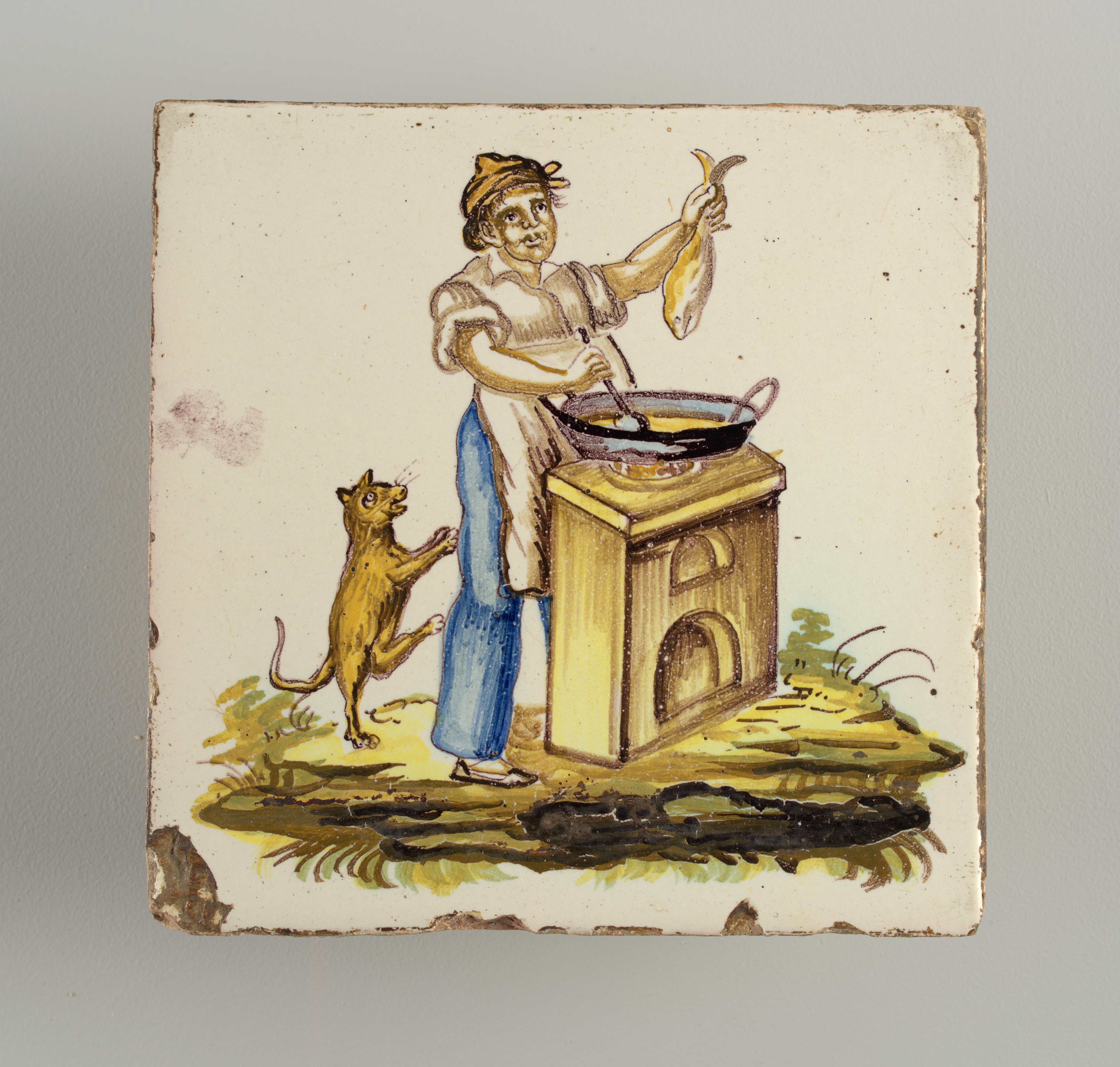 This is a tile. It is dated late 18th–early 19th century and we acquired it in 1920. Its medium is earthenware, glazed and high fire decorated. It is a part of the Product Design and Decorative Arts department.