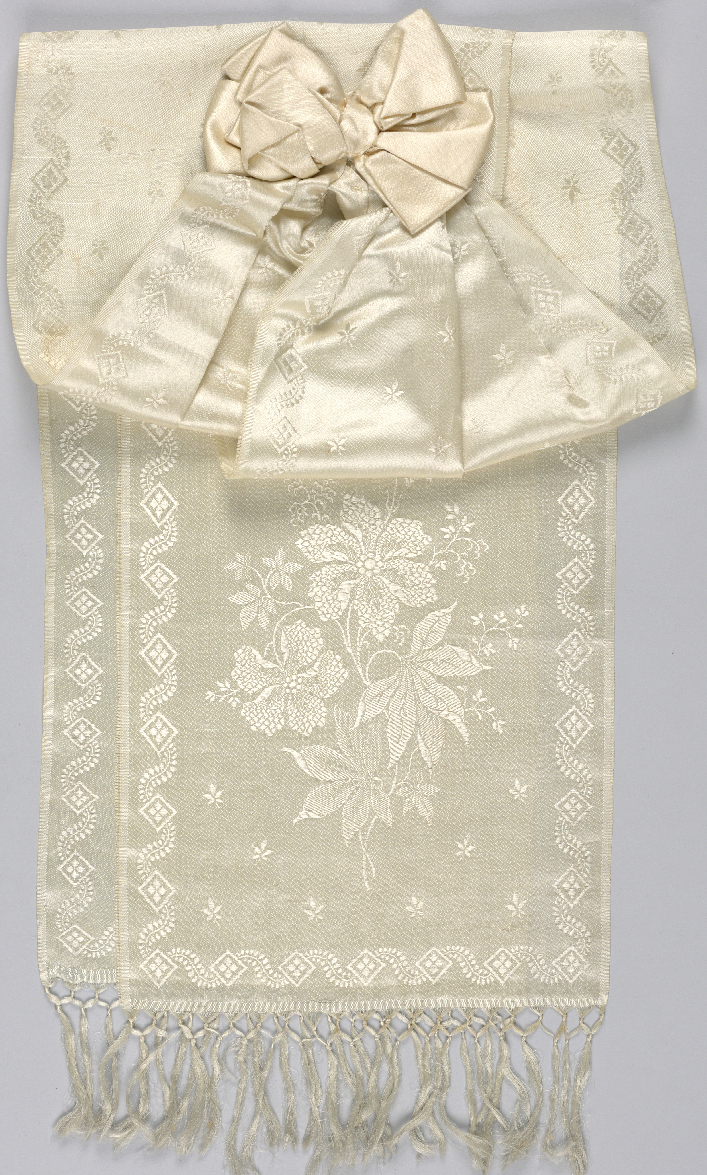 This is a Bow with ribbons. It is dated ca. 1875 and we acquired it in 1920. Its medium is silk (?) and its technique is satin weave. It is a part of the Textiles department.