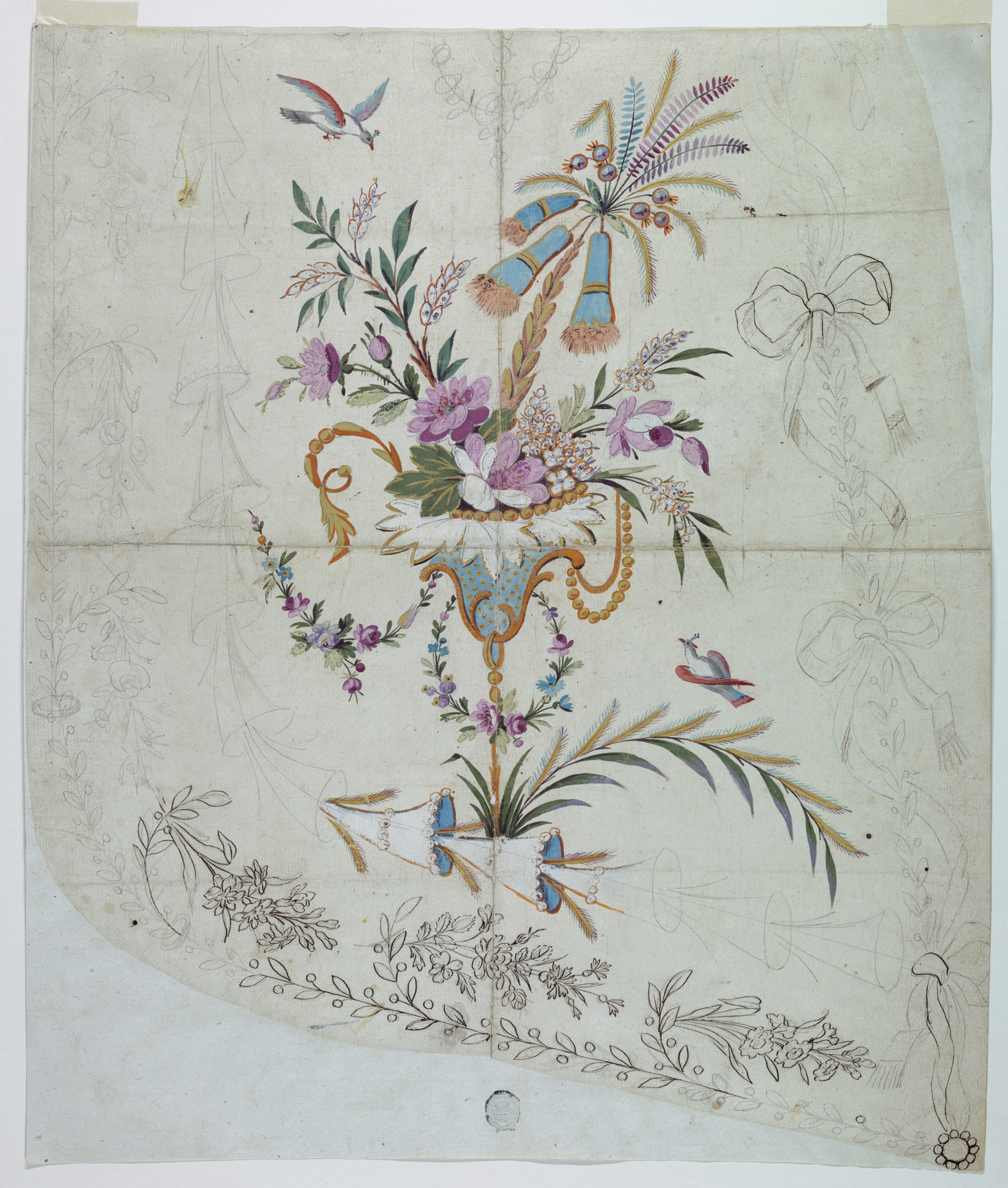 Drawing, Design for the Embroidery of the Lower Part of an Overskirt of the "Fabrique de St. Ruf," Unfinished; Designed by Fabrique de Saint Ruf; France; graphite, pen and ink, brush and gouache on paper; 57.7 × 48.8 cm (22 11/16 × 19 3/16 in.); Gift of Eleanor and Sarah Hewitt; 1920-36-186