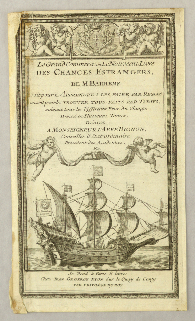 Print, Title Page of "Le Grand Commerce ou Le Nouveau Lire Des Changes Estranges" by Bertrand-François Barrême (1640–1703); etching and engraving on paper; 12.1 × 21.8 cm (4 3/4 × 8 9/16 in.); Gift of Eleanor and Sarah Hewitt; 1921-22-313