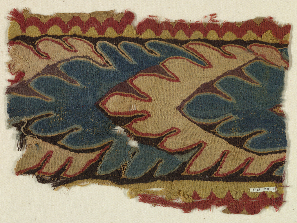This is a Fragment. It is dated 300–900 and we acquired it in 1921. Its medium is linen, wool and its technique is plain weave with discontinuous wefts (tapestry). It is a part of the Textiles department.