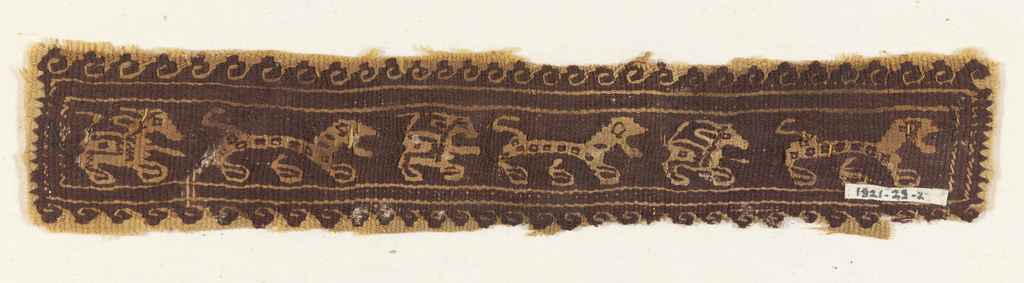 This is a Band fragment. It is dated 4th–5th century and we acquired it in 1921. Its medium is s-spun undyed linen weft, s-spun undyed wool warp and weft and its technique is slit tapestry weave. It is a part of the Textiles department.