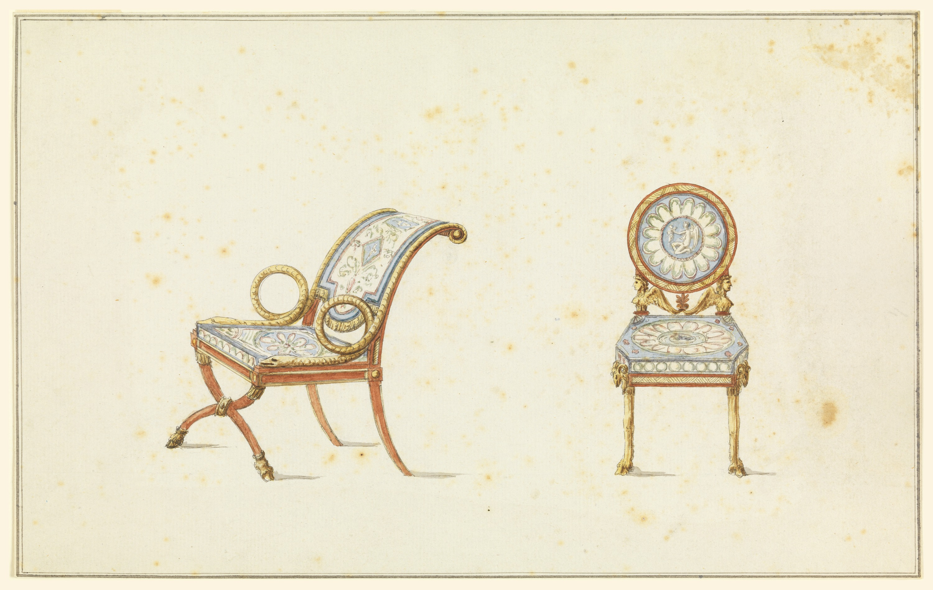 Drawing, Design for Two Chairs; Designed by Jean Démosthène Dugourc (French, 1749–1825); Attributed to Georges Jacob (French, 1739–1814), Henri Jacob (1753–1824); Germany; brush and watercolor, pen and black ink, graphite on white laid paper; 21 x 34 cm (8 1/4 x 13 3/8 in.); Purchased for the Museum by the Advisory Council; 1921-6-133-1