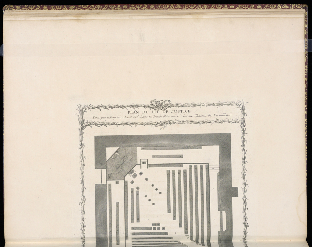 <ref name=CH>{{cite web |url=https://www-4.collection.cooperhewitt.org/objects/18221203/ |title=Bound Print, Plan du Lit de Justice, Tenu par le Roy le Aoust 1756. dans la Grande Sale des Gardes au Château de Versailles. |author=Cooper Hewitt, Smithsonian Design Museum |accessdate=20 December 2025 |publisher=Smithsonian Institution}}</ref>