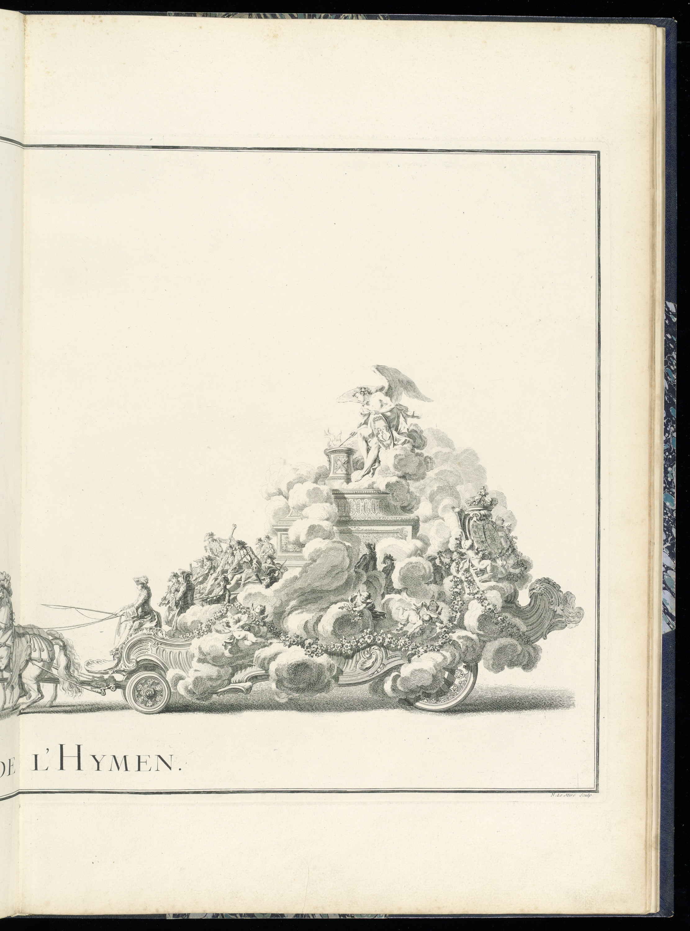 Bound Print, Char de l'Hymen.; Print Maker: Noël Le Mire (French, 1724–1800); Published by François Blondel, Marguerite Caillou Chéreau (French, active 1729–1755); France; engraving on laid paper; Sheet: 62.9 × 88 cm (24 3/4 × 34 5/8 in.) Platemark: 46.7 × 82.5 cm (18 3/8 × 32 1/2 in.) Image: 45.2 × 81.4 cm (17 13/16 × 32 1/16 in.); Purchased for the Museum by the Advisory Council; 1921-6-207-25