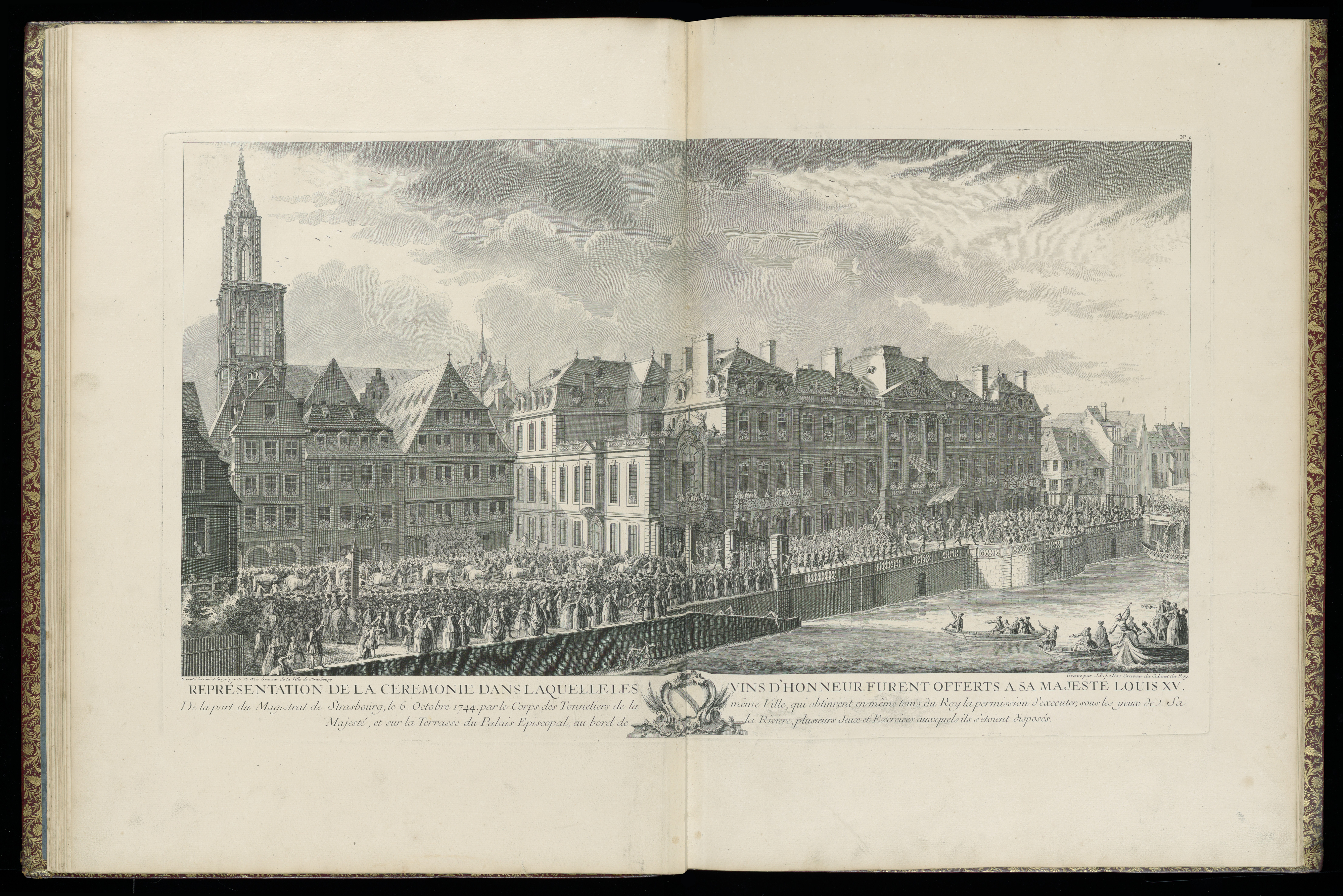 Lettered in plate, lower center : REPRÉSENTATION DE LA CEREMONIE DANS LAQUELLE LES VINS D’HONNEUR FURENT OFFERTS A SA MAJESTÉ LOUIS XV/ De la part du Magistrat de Strasbourg, le 6 Octobre 1744 par le Corps des Tonneliers de la même Ville, qui obtinrent en même tems du Roy la permission d’executer, sous les yeux de Sa/ Majesté, et sur la Terrasse du Palais Episcopal, au bord de la Riviere, plusieurs Jeux et Exercices auxquels ils s’etoient disposés.; numbered upper right : No.9