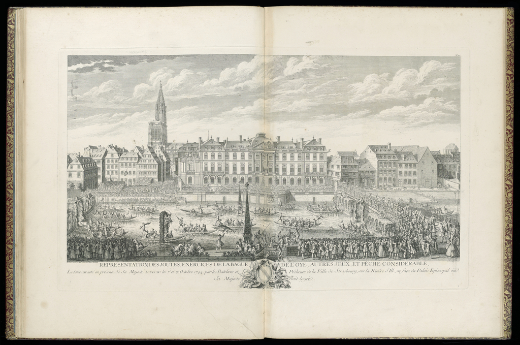 Inscribed in plate, lower center: RÉPRÉSENTATION DES JOUTES, EXERCICES DE LA BAGUE, DE L’OYE, AUTRES JEUX, ET PÊCHE CONSIDÉRABLE / Le tout executé en présence de Sa Majesté Louis XV. les 7° et 8° Octobre 1744. par les Bateliers et Pêcheurs de la Ville de Strasbourg, sur la Riviére d’Ill, en façe du Palais Episcopal où / Sa Majesté étoit logée.; numbered upper right : No.10