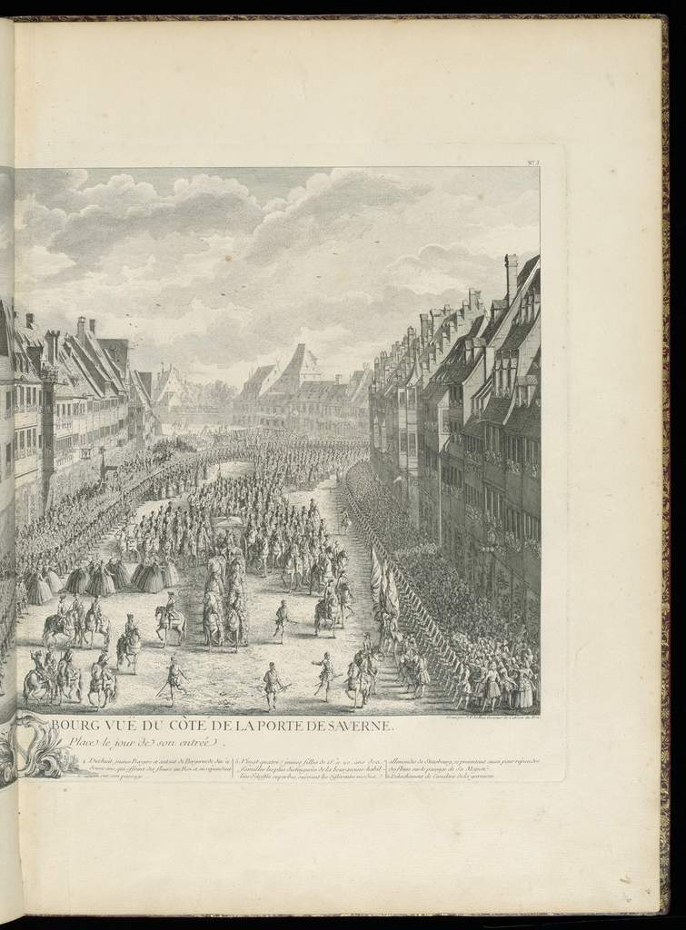 Lettered in plate, lower center : REPRÉSENTATION D’UNE PLACE DE STRASBOURG VUË DU CÔTÉ DE LA PORTE DE SAVERNE. / Le Roi LOUIS XV. traversa cette Place le jour de son entrée/ 1. Carosse du Roi environné des Gardes du Corps, et/ suivi des Troupes bourgeoises à la tête des quelles/ étoit M. de Klinglin Preteur Royal de Strasbourg./ 2. Troupes de la garnison rangées en haye à droite et à / gauche, et derriere ces Troupes grand affluence de peuple/ tant habitans de la Ville et de la Province qu’etrangers./ 3. Amphithéâtre elevé en face de la porte de la Ville sur lequel étoient en/ grand nombre les plus jeunes enfans de la Ville proprement / vétus et crians : Vive le Roi/ 4. Dixhuit jeunes Bergers et autant de Bergeres de dix à / douze ans, qui offrent des fleurs au Roi et en répandent / sur son passage. / 5. Vingt quatre jeunes filles de 15 à 20 ans des/ familles les plus distinguées de la bourgeoisie habil-/lées d’étoffes superbes, suivant les différentes modes/ allemandes de Strasbourg, se présentant aussi pour répandre/ des fleurs sur le passage de Sa Majesté/ 6. Détachement de Cavalerie de la garnison; numbered upper right : No.3