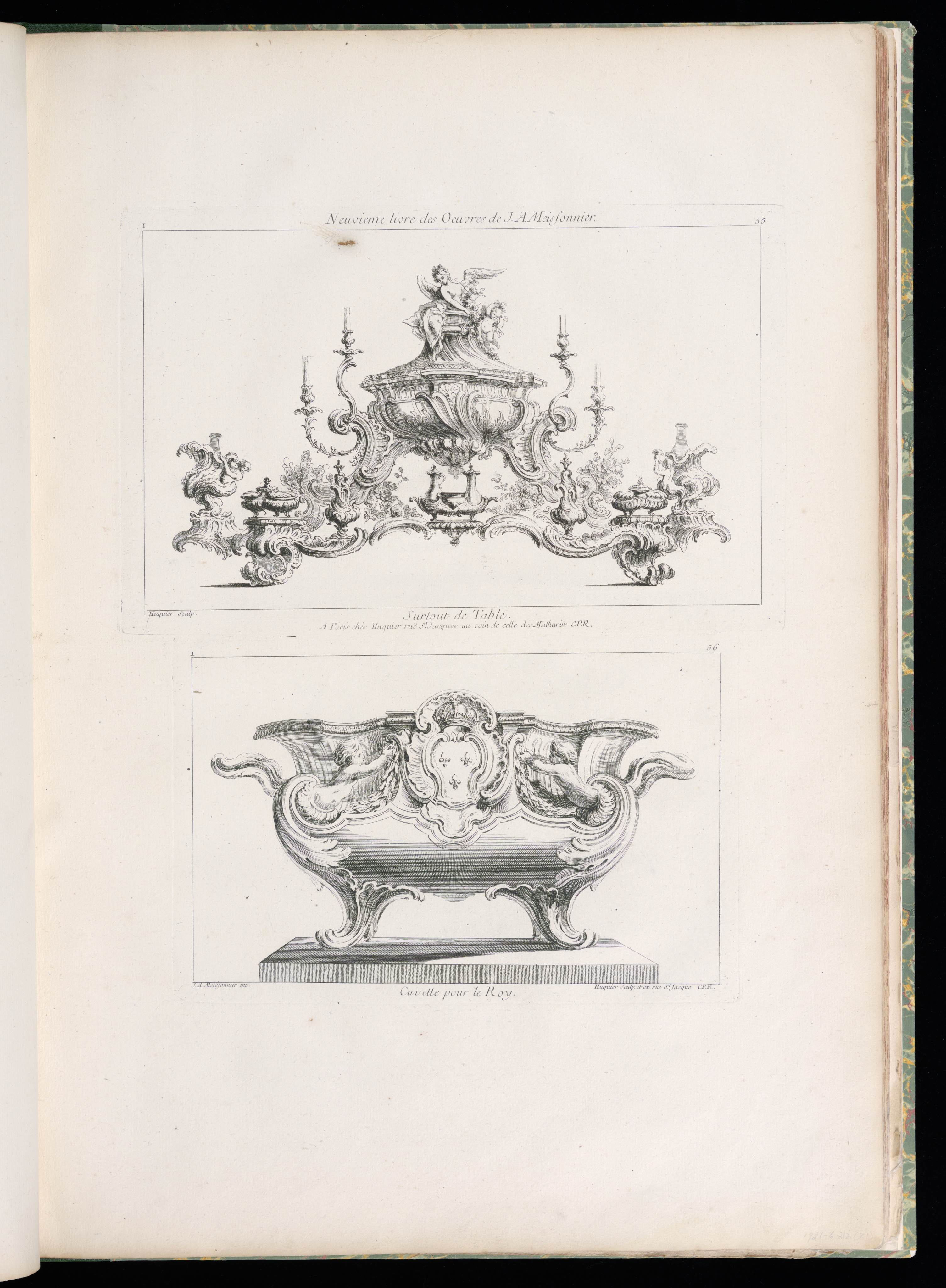 <ref name=CH>{{cite web |url=https://www-4.collection.cooperhewitt.org/objects/18222479/ |title=Print, Neuvième Livre des Oeuvres de J.A. Meissonnier, Surtout de Table/Cuvette de Roy [Ninth Series of Designs from the work of J.A. Meissonnier, Design for Table Centerpiece/King's Bowl], pl. 55 in Oeuvre de Juste-Aurèle Meissonnier |author=Cooper Hewitt, Smithsonian Design Museum |accessdate=19 December 2025 |publisher=Smithsonian Institution}}</ref>