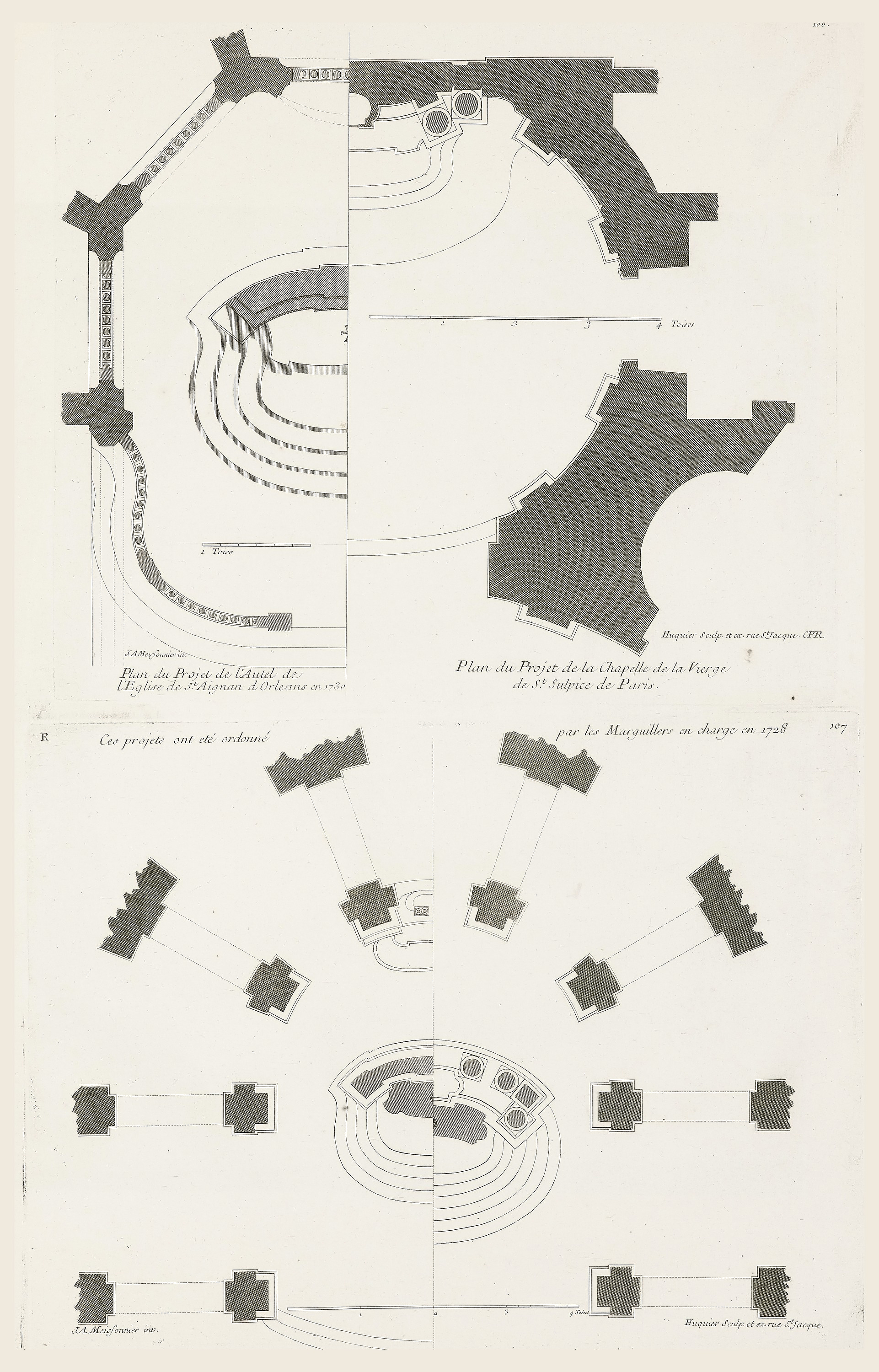 Inscribed in plate, upper left: R; upper right: 106; lower left: Plan du Projet de / l'Autel de l'Eglise de St. Aignan dOrleans en 1730; lower right: Plan du Projet de la Chapelle de la Vierge / de St. Sulpice de Paris.