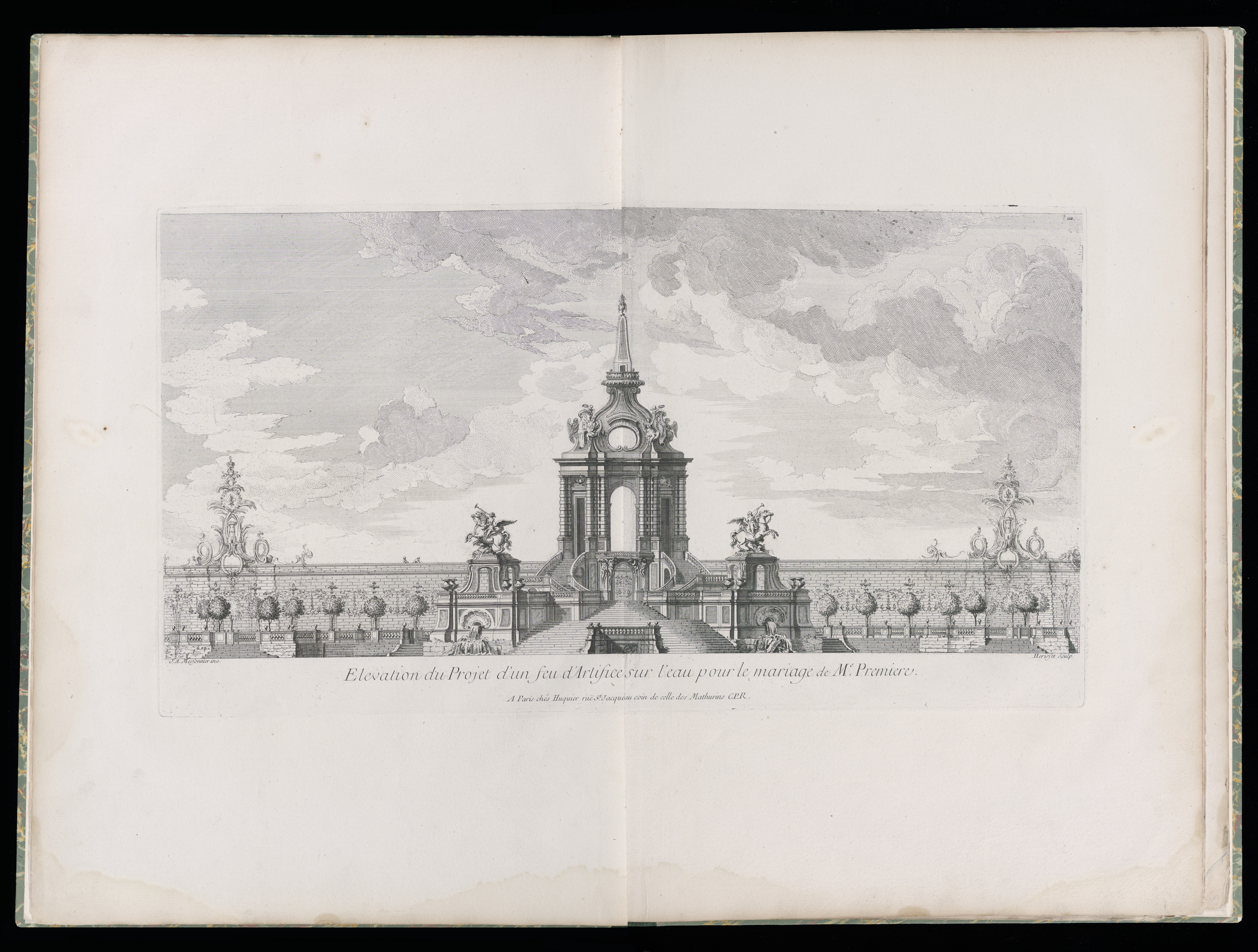 Inscribed in plate, upper right: 112.; lower center: Elevation du Projet d'un feu d'Artifice sur l'eau pour le mariage de Me. Premiere. / A Paris chés Huquier rue St. Jacque au coin de celle des Mathurins C.P.R.