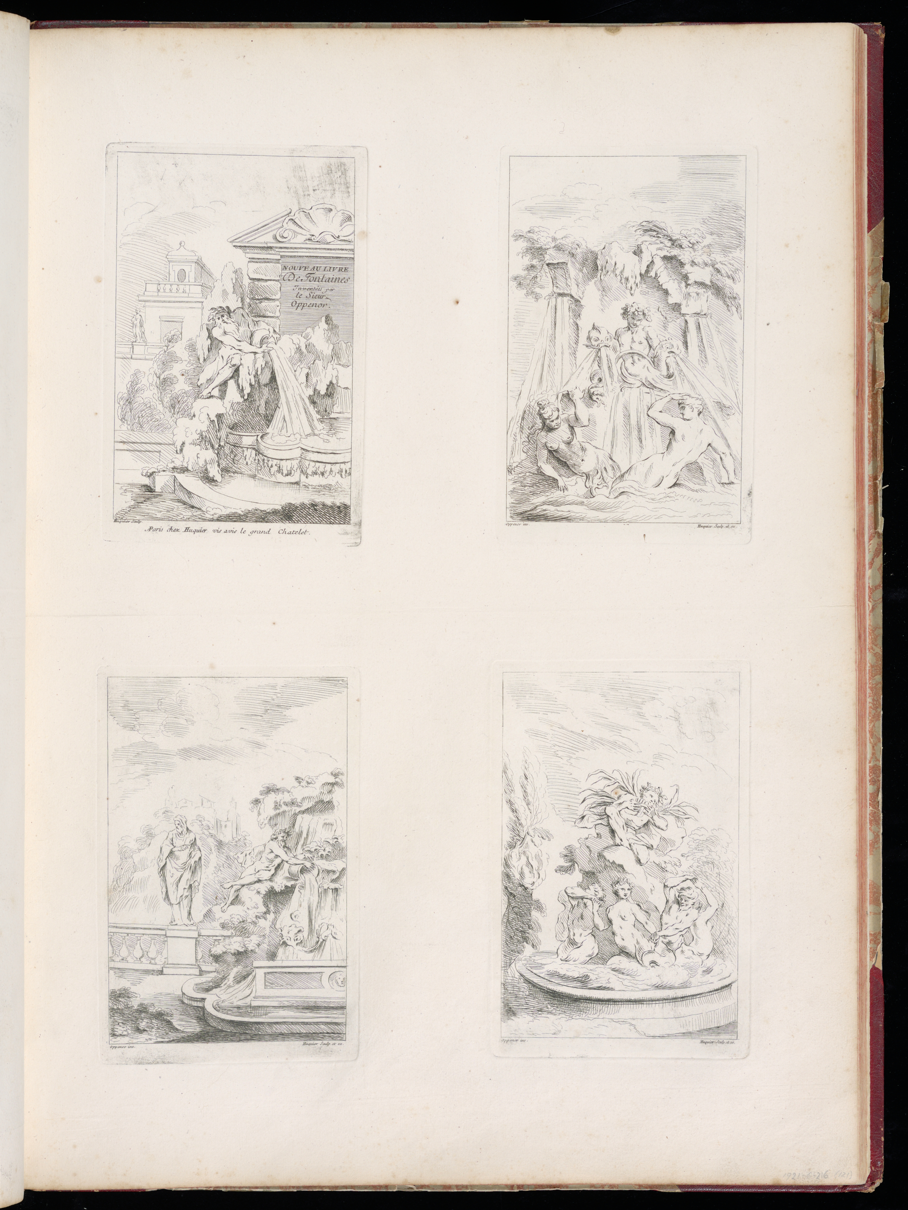 Upper Left plate: Printed upper right center, in plate: NOUVEAU LIVRE / De Fontaines / Inventées par / le Sieur / Oppenor.; Printed lower center, in plate: AParis chez Huquier vis avis le grand Chatelet. Inscribed in graphite, lower right, in margin: 1921-6-216 (121)
