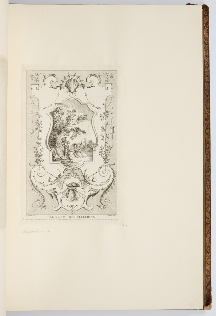 Printed lower center, in plate: LE REPOSE DES PELLERINS / AParis chez la V.de F.Chereau rue S.Jaque aux deux Pilliers d'or; Et chez Huquier vis a vis le grand Chatelet AvecPrivilege du Roi; Inscribed in graphite, lower left, in margin: Cat: Goncourt. No. 262.; Inscribed in graphite, lower right, in margin: 8.x