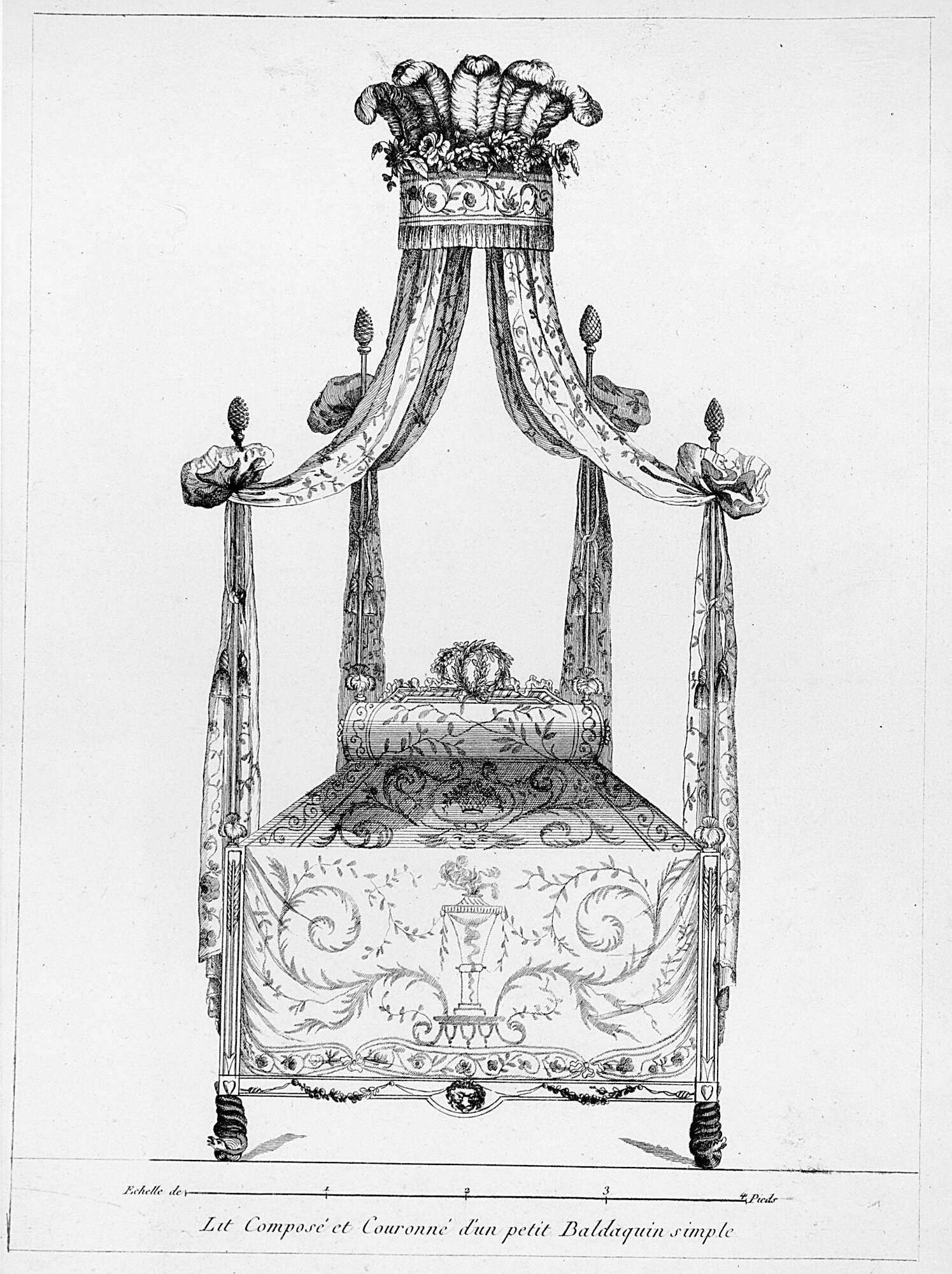 In graphite below plate, lower right: 7 Imprinted from lower right: Echelle de Pieds/Lit Compose et Couronne d'un petit Baldaquin simple. Imprinted in upper right margin: 6