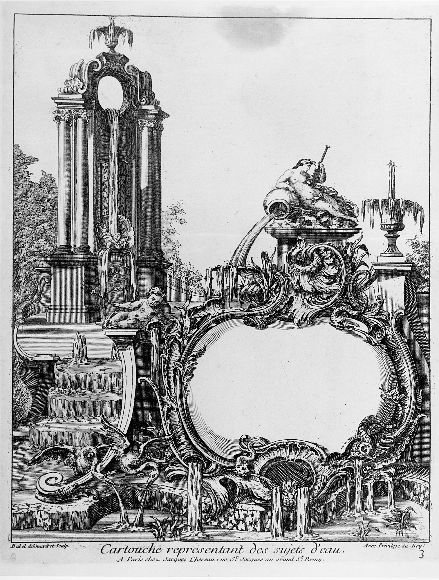Printed lower center, in plate: Cartouche representant des sujets d'eau. / A Paris chez Jacques Chereau rue St. Jacques au grand St. Remy.; Printed lower right, in plate: Avec Privilege du Roy. / 3; Inscribed in graphite, lower left, in plate: 6; Inscribed in graphite, lower right, in margin: 9 / 1921-6-231 (9)