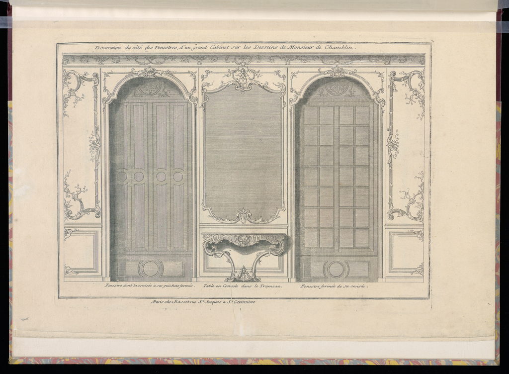 Lettered in plate, upper center: Decoration du côté des Fenestres, d’un grand Cabinet sur les Desseins de Monsieur de Chamblin: lettered lower center : Fenestre dont la croisée à ses guichets fermés. Table en Console dans le Trumeau. Fenestre fermée de sa croisée.; inscribed in graphite lower left margin : 8