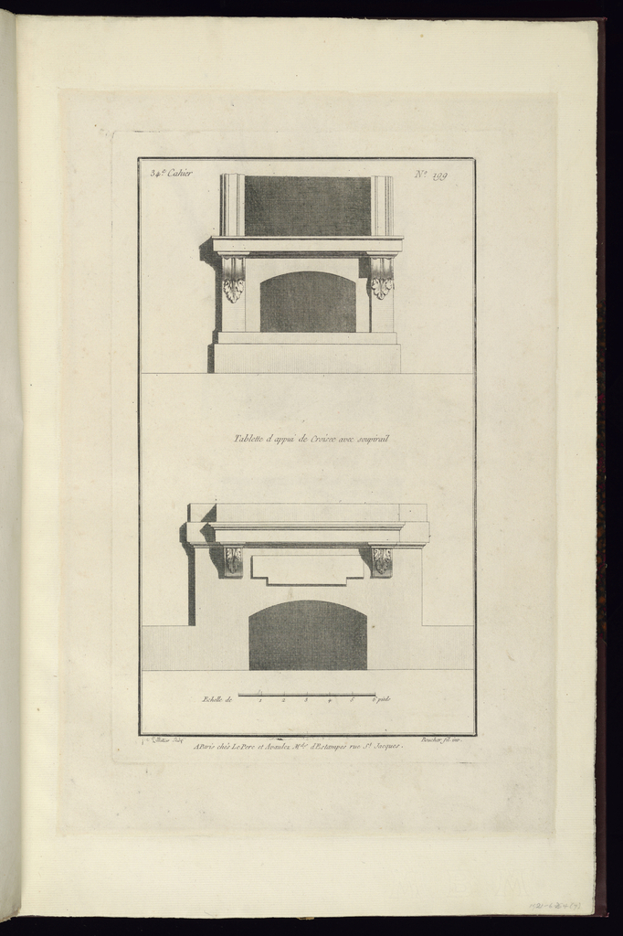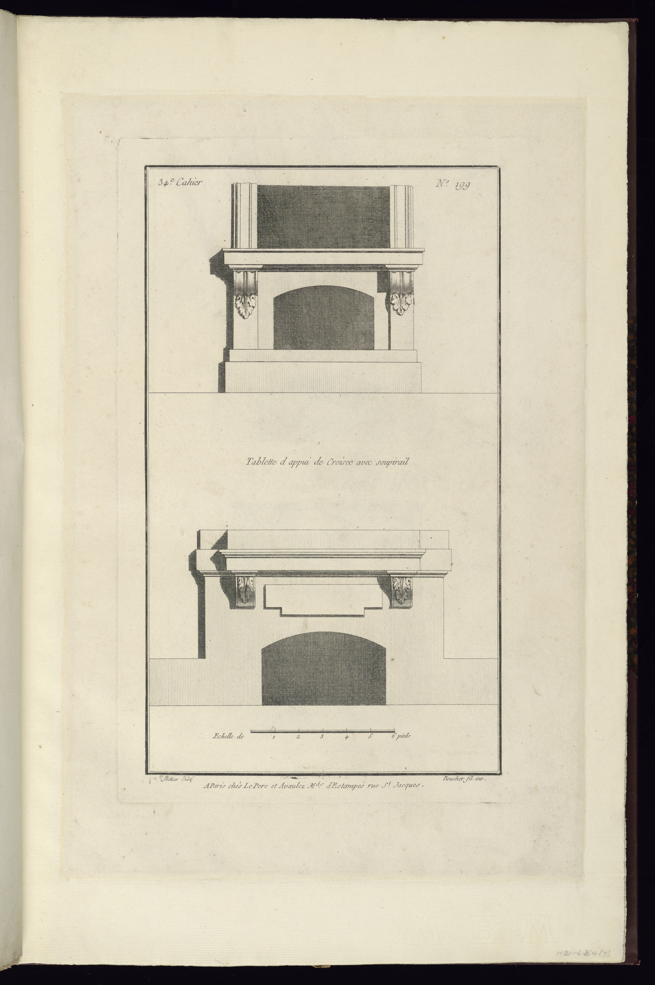 Printed upper left, in plate: 34e. Cahier; Printed upper right, in plate: No. 199; Printed center, in plate: Tablette d appui de Croisée avec soupirail; Printed lower center, in plate: A Paris chés Le Pere et Avaulez Mds. dEstampes rue St. Jacques.; Inscribed in graphite, lower right, in margin: 1921-6-254 (7)