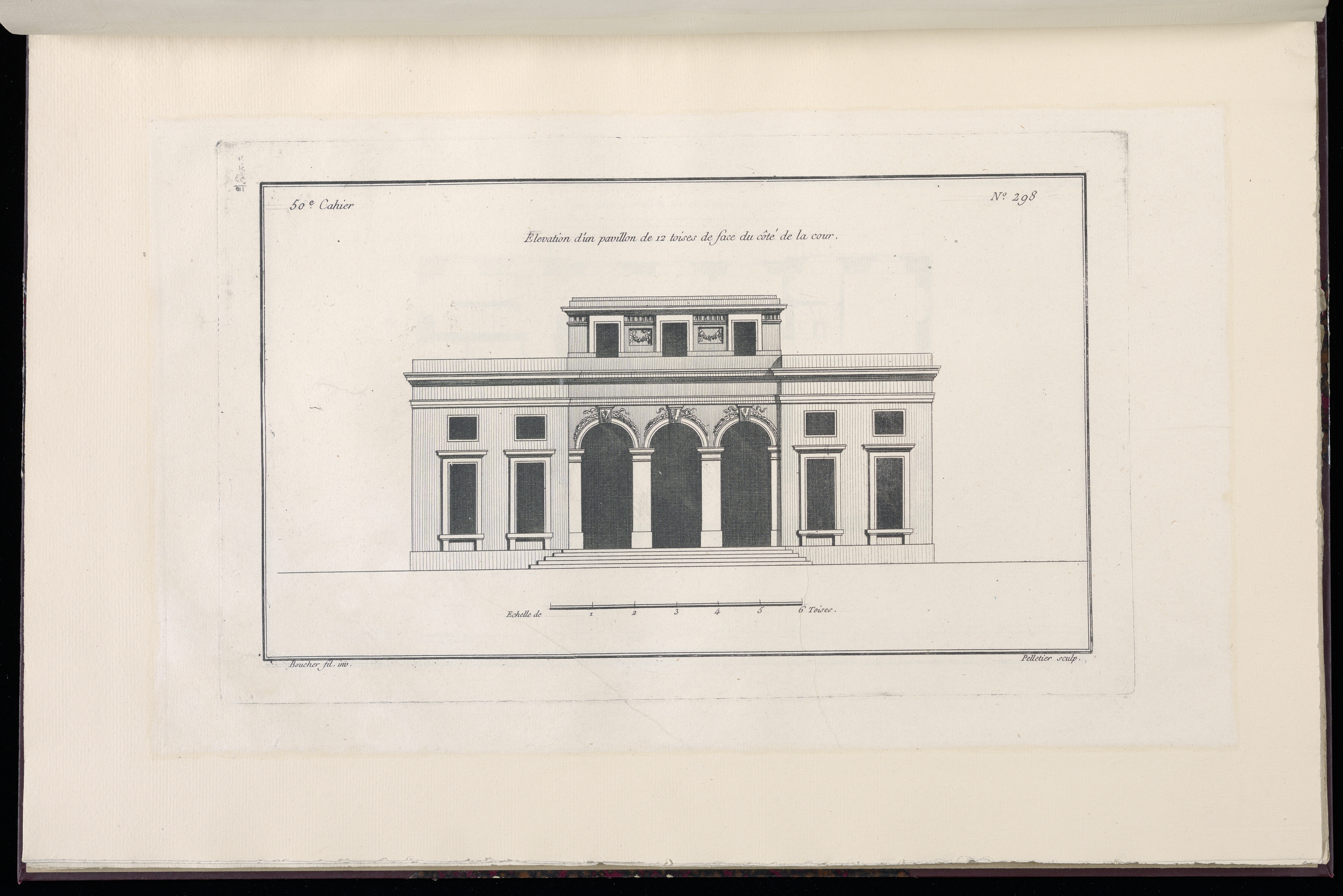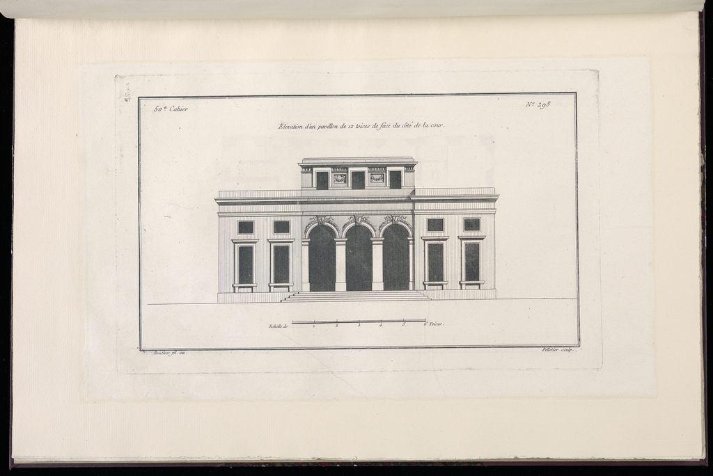 Printed upper left, in plate: 50e. Cahier; Printed upper center, in plate: Elevation d'un pavillon de 12 toises de face du côté de la cour; Printed upper right, in plate: No. 298
