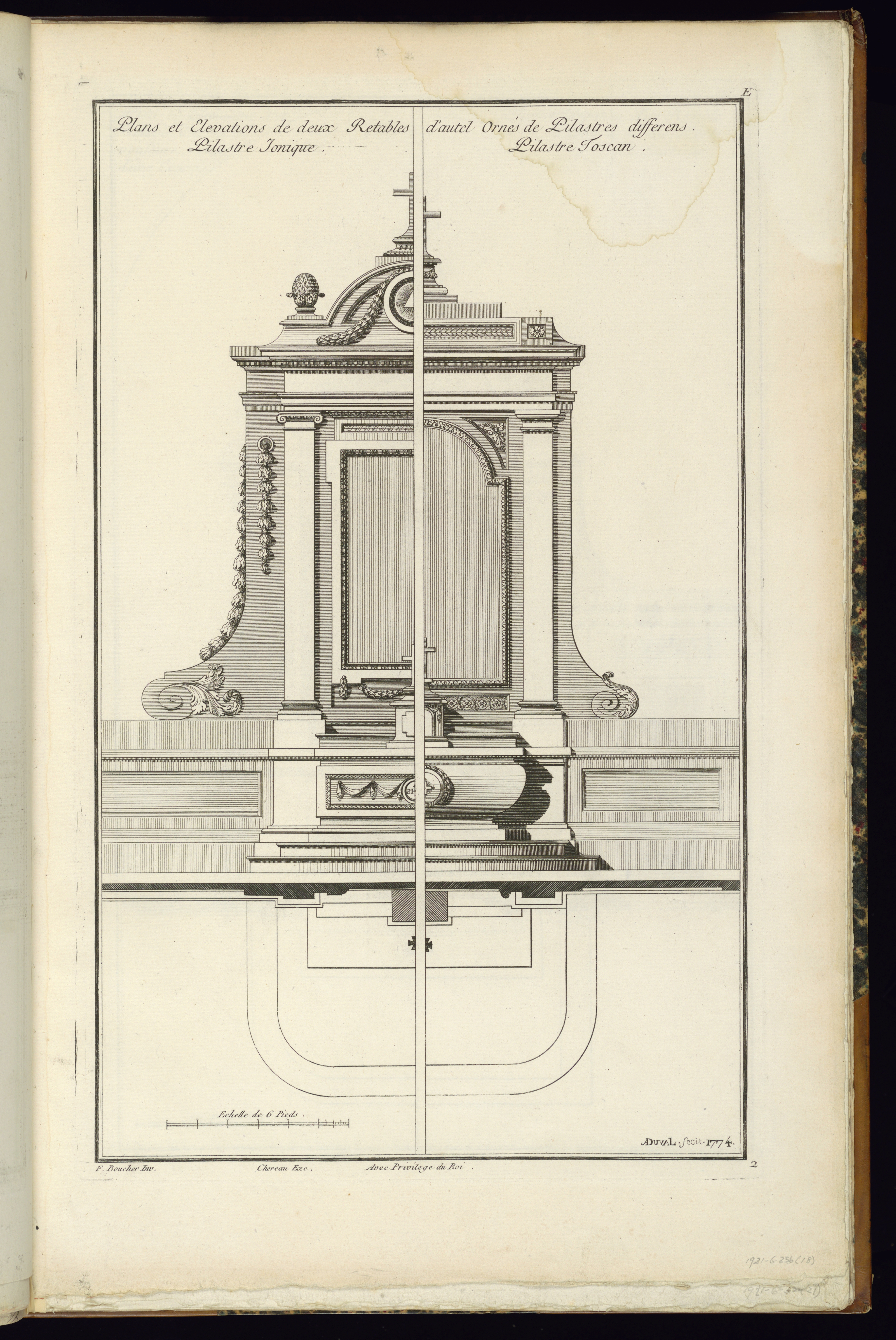 Printed upper center, in plate: Plans et Elevations de deux Retables d'autel Ornés de Pilastres differens / Pilastre Ionique. Pilastre Toscan .; Printed upper right, in plate: E; Printed lower center, in plate: Chereau Exc. Avec Privilege du Roy; Printed lower right, in plate: 2; Inscribed in graphite, lower right, in margin: 1921-6-256 (18)